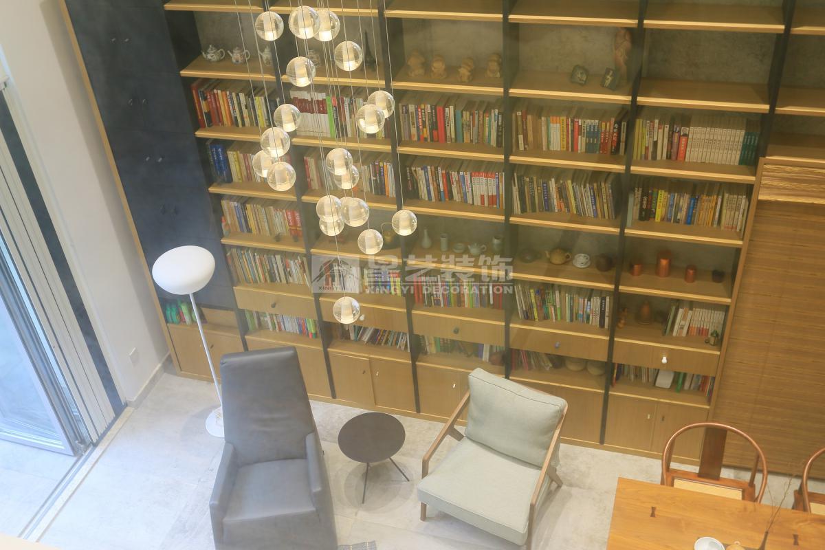 挑空的客厅空间宽敞明亮,大量木质材料唤醒人们心中对大自然无限渴望,深色系的沙发与水泥灰相得益彰