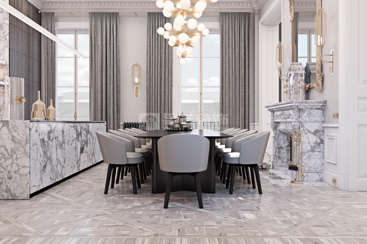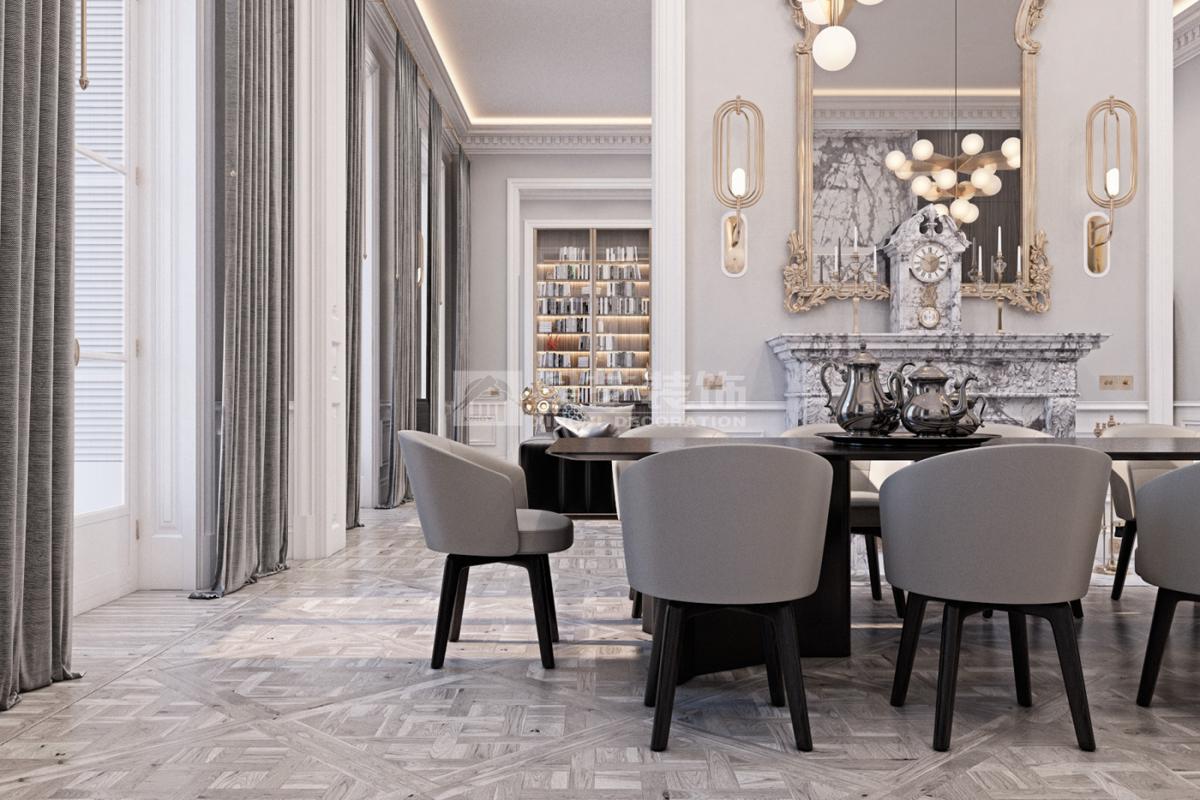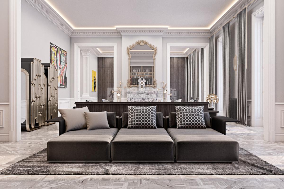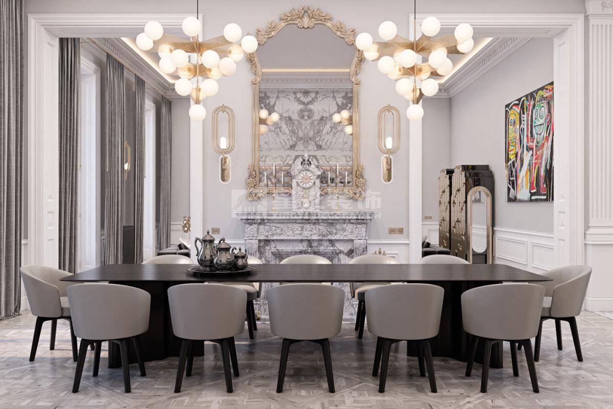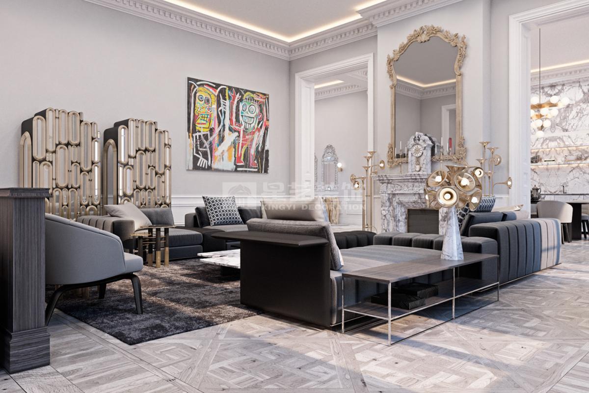在造型选择方面,通常的法式轻奢风格都会添加曲线,这是法式元素里随处可见的一种设计,并且还结合了几何框架和方正矩形的造型,这样使整个设计变得刚中带柔,恰得好处。例如:沙发、茶水案几、电视柜的矩形框架装饰和圆形吊灯的搭配非常完美。