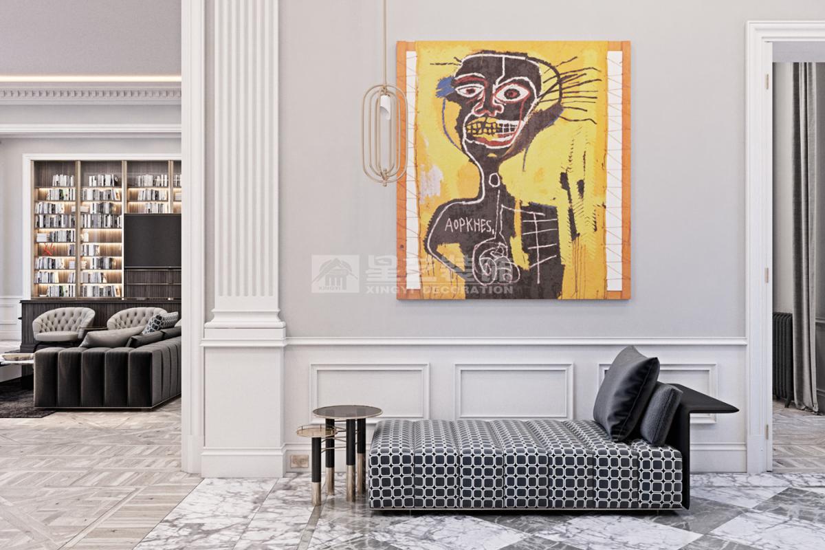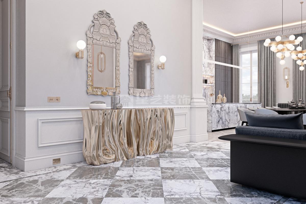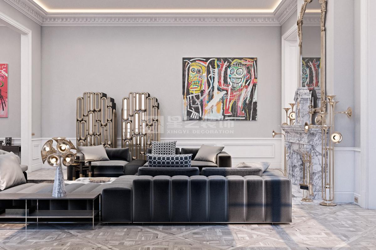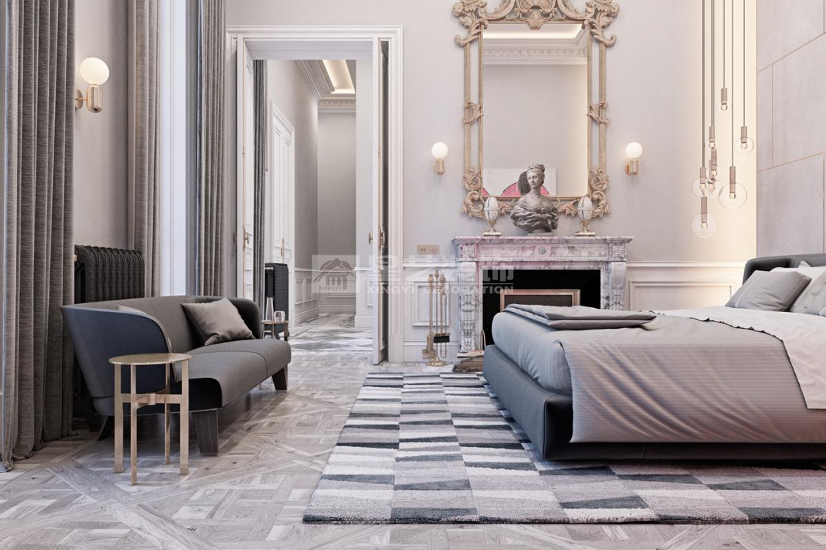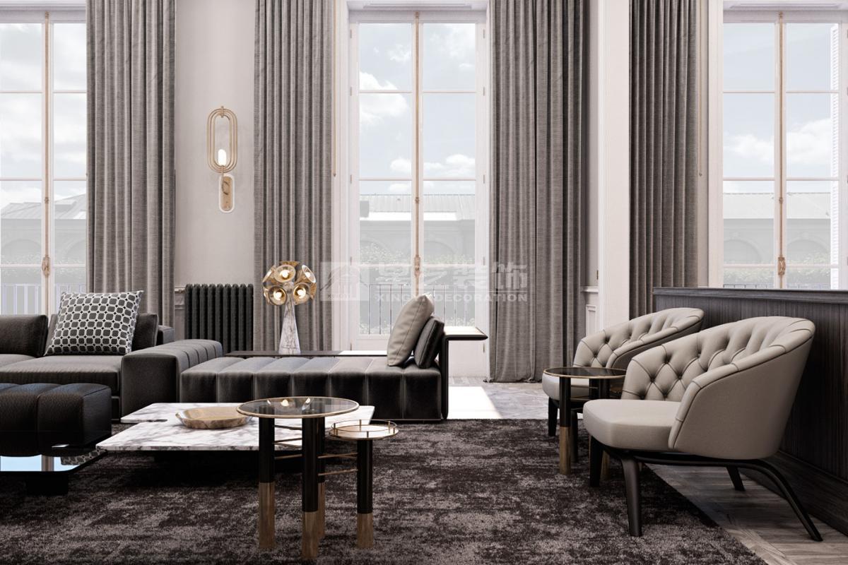 在造型选择方面,通常的法式轻奢风格都会添加曲线,这是法式元素里随处可见的一种设计,并且还结合了几何框架和方正矩形的造型,这样使整个设计变得刚中带柔,恰得好处。例如:沙发、茶水案几、电视柜的矩形框架装饰和圆形吊灯的搭配非常完美。