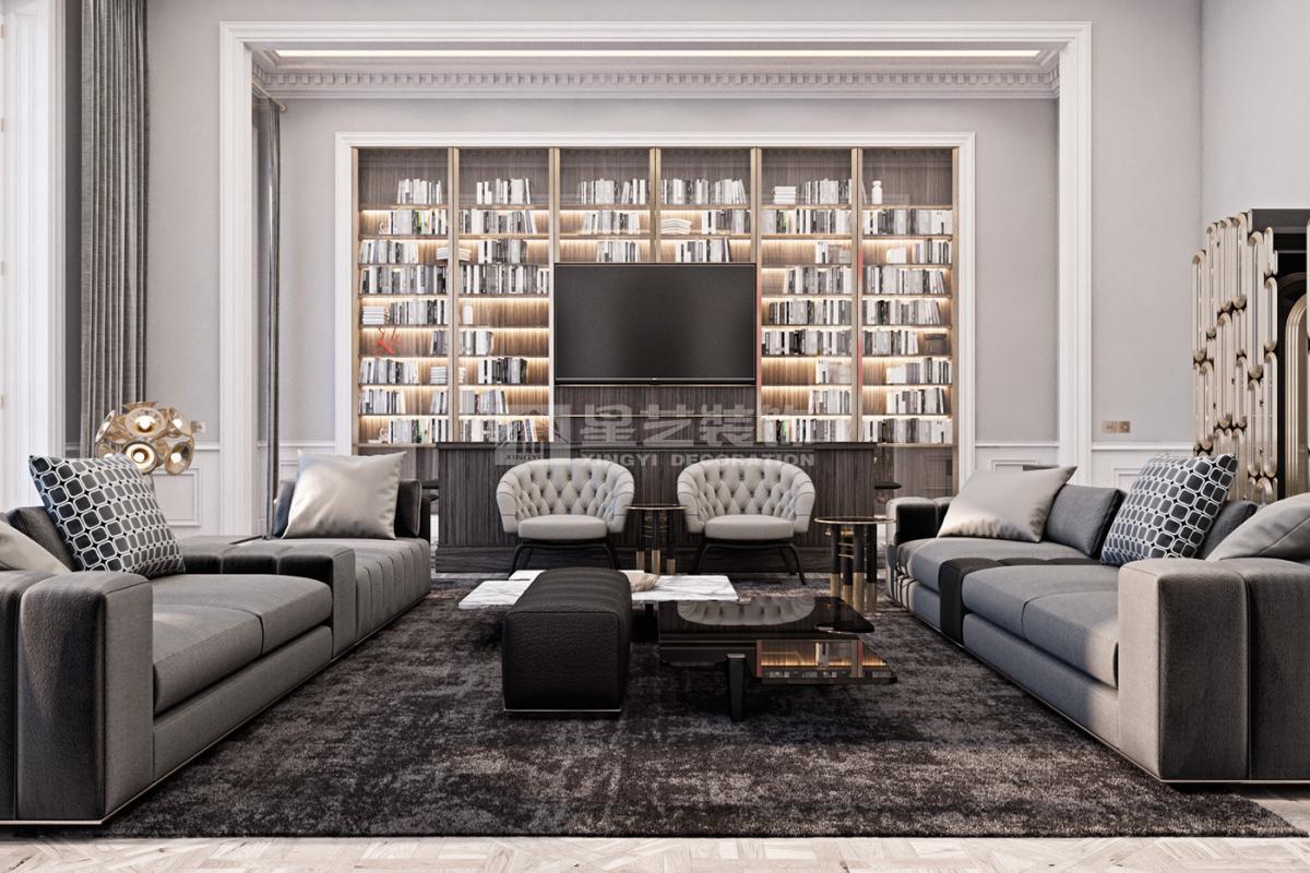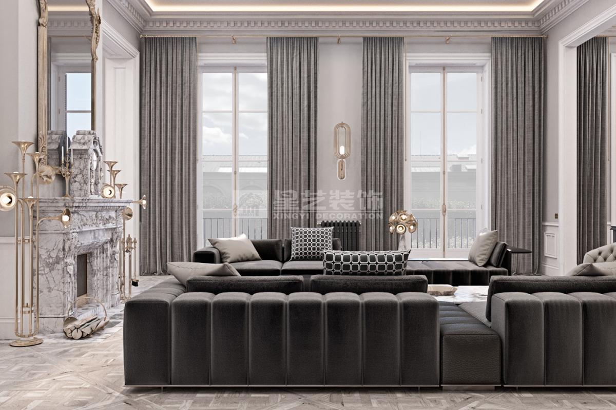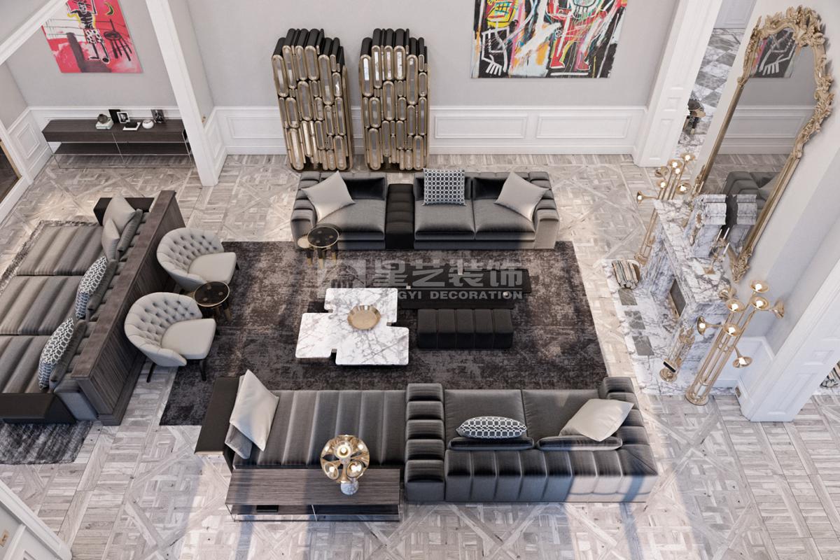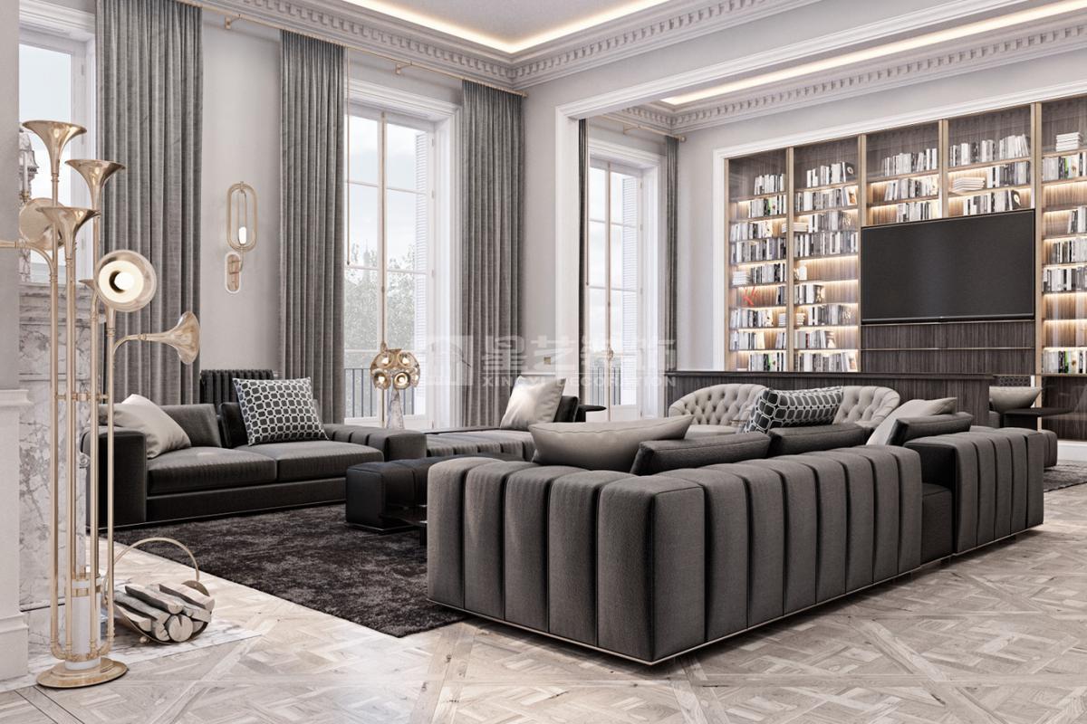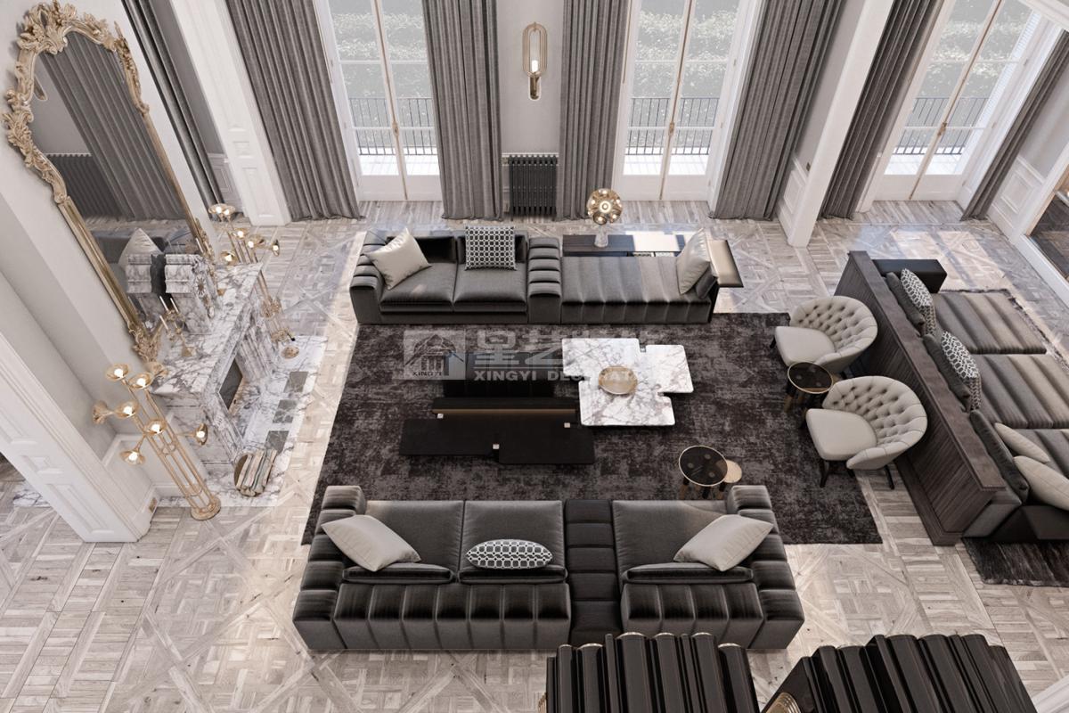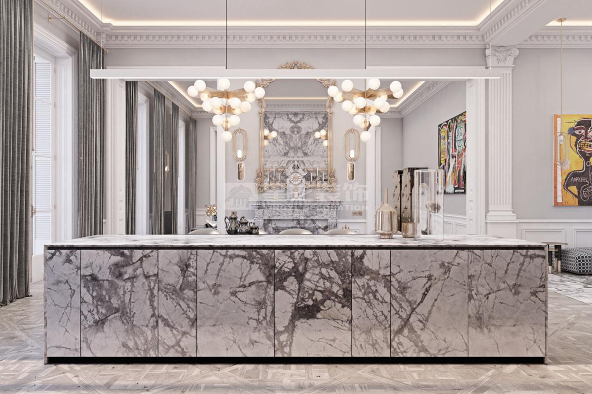 在造型选择方面,通常的法式轻奢风格都会添加曲线,这是法式元素里随处可见的一种设计,并且还结合了几何框架和方正矩形的造型,这样使整个设计变得刚中带柔,恰得好处。例如:沙发、茶水案几、电视柜的矩形框架装饰和圆形吊灯的搭配非常完美。