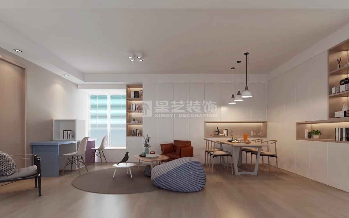 业主一家四口居住,老人偶尔过来共聚天伦,所以除了两个小孩的房间和主卧,还要考虑有老人过夜的休息空间。小户型空间有限,充分利用空间,增加储物和实用功能,同时要显得空间不要太压迫,因此选择了简单的北欧风格,采用白色哑光烤漆的柜体加以浅木色的点缀,并搭配不规则的沙发摆放形式,打造一个小孩在可以在客厅活动的空间,打破常规客厅沙发组合的传统,营造新型实用美观的客厅空间。