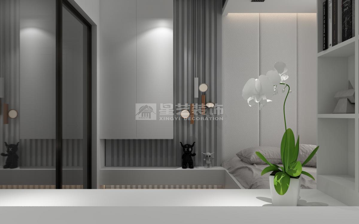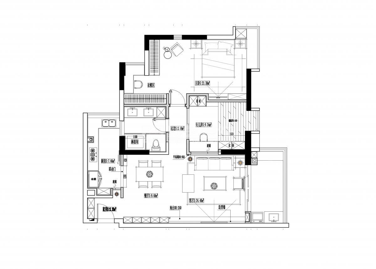 本案的业主是一对年轻的新婚夫妇,注重生活体验与情趣, 在入户区与厨房的隔墙中间我开了一个长床,找增加空间的联系性和光影的互动中,给业主制造了这个生活窥探的情景趣味, 将原本的3房格局改为两房,增大衣帽区也增加了卫生间的功能,同样的也满足了现阶段的生活需求, 沙发背后开了一个方窗也是在营造有趣的生活场景和氛围,先生在沙发上看电视,太太可以,敲敲玻璃对他做一个鬼脸,空间是为人服务的,我觉得就应该赋予它一些情感。空间会爱上你,同样你也会爱上这个空间。