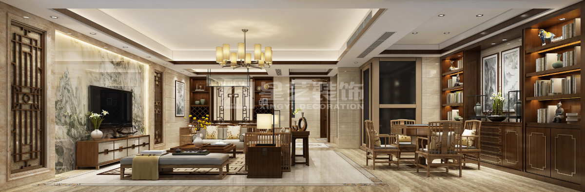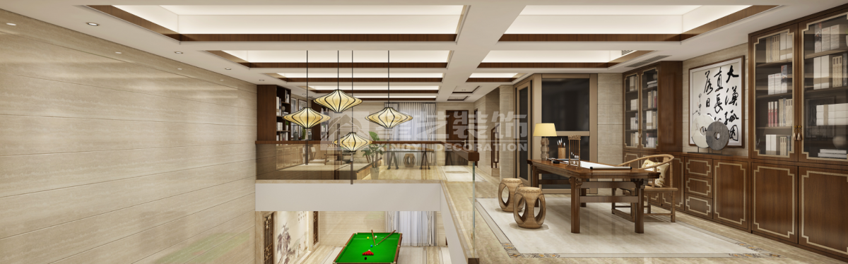 本案是一套叠墅,总面积约500㎡,主人用于休闲度假及接待朋友,希望做得比较大气些,案例中颜色及图案形式均采用新中式元素,彰显主人的品味