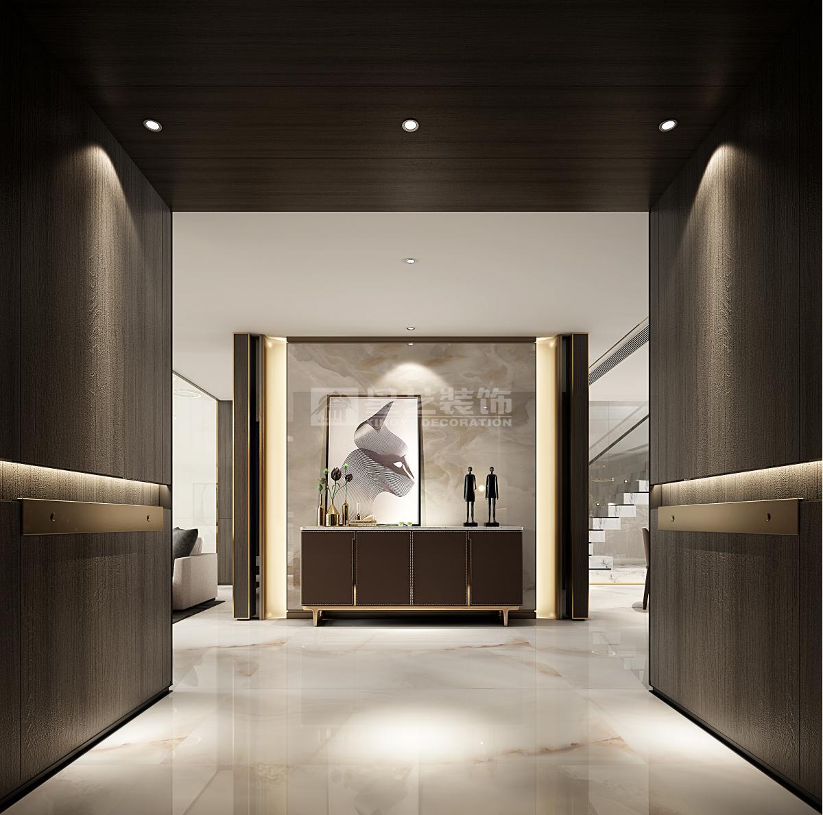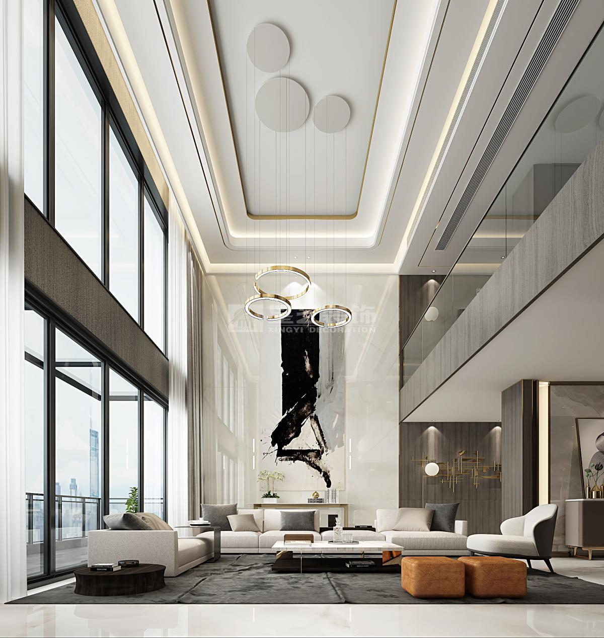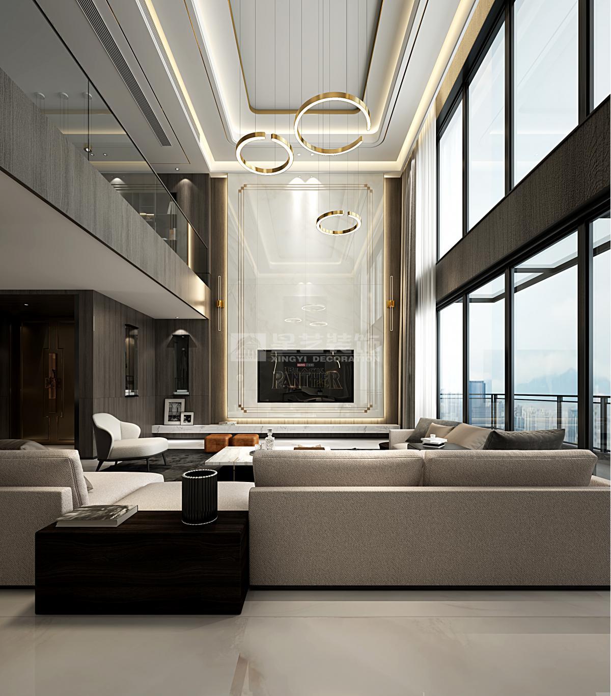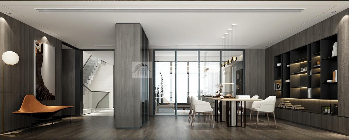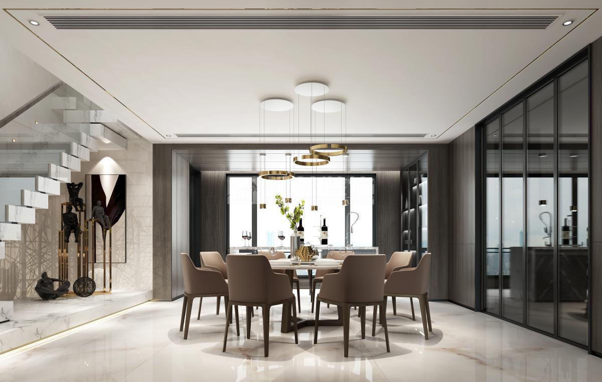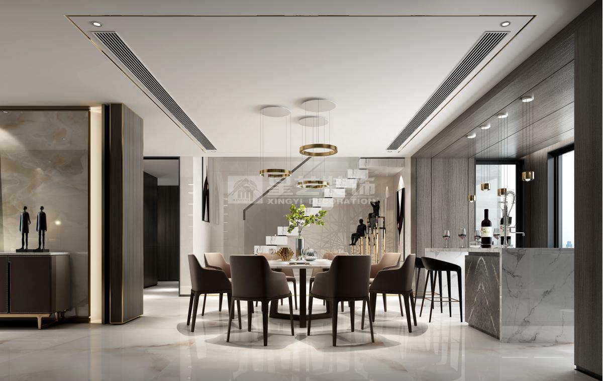 理想生活诉求 人们的生活观念与生活方式,随着高速发展的社会经济、文化、交通、信息而发生转变,尤其对于占据更多优质城市资源的高净值人士而言,商务社交、家庭宴请需求更紧密、更高频。 因此,兼具商务会客功能的私宅,作为企业家私人城市会客厅愈来越受企业主青睐。 区别于品质型家庭生活居所为主要功能的私宅,本案作为70s私人企业主居所 要兼具品质型家庭生活以及商务会客与家庭宴请的功能需求。会客与家宴场景多以主人及其所在圈层挚友的兴趣爱好作为空间功能规划的首要考量条件。 基于主人诉求,将本案定位为企业家私人城市会客厅。因此,整体空间布局的设计考量主要有两点: 首先,将主要临江江景以及空间近2/3的面积,让渡给公共会客区域,形成主会客厅与茶区平台双会客区格局,且兼顾主人午间小憩时的卧室景观需求; 其次,餐厅与品酒区以及户外露台形成联动,同时,将厨房隐藏起来,更适配商务会客用餐场景。 空间氛围营造与审美取向上,以品质感与醇厚感为基底,把握着现代生活意韵与商务气度之分寸,调性冷暖相交,与木与石交织中增加跳色的悦动,有家居生活之底蕴,着墨茗茶品酒间也不失礼于宾客亲友。