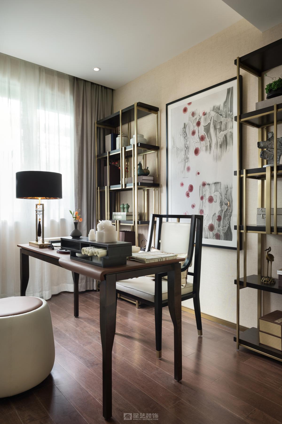 艺术的诗意与生活的意趣交融协奏,镜面屏风的朦胧山水,与框住劲石苍松画卷的圆形墙面装置意蕴相衬,精致的细节奏响空间气质的旋律。葳蕤繁茂的金色枝芽,环绕着餐厅的艺术灯饰,与当代工艺材质造就的古典纹路花饰座椅一起,为空间注入更多清逸雅韵。