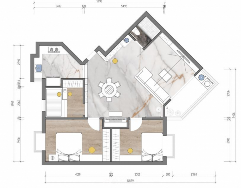 客户一家四口, 夫妻二人加双胞胎兄弟,格局保留3房。 两卫做成一卫干湿分区,主卫改成衣帽间连接梳妆台,水管砌墙做隔音棉,睡眠质量不会得到打扰。 这个方案打动业主的一点是沙发在中间 背后是餐桌,家里人可以一起看电视吃饭,小孩在也可趴着沙发边和父母一起看电视,其乐融融的一家人也不缺失孩子的成长。 风格上上喜欢木饰面元素多一些。 业主有两个儿子,大儿子习惯古色古香的中国元素,小儿子则不同,喜欢现代风格,主人房则喜欢简约温暖风格,一家3种风格。