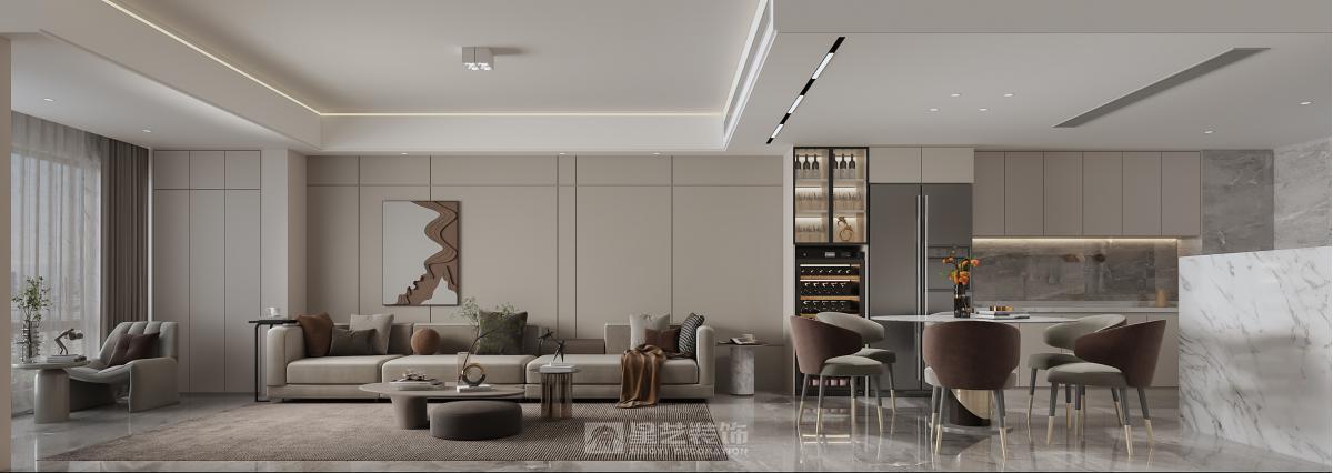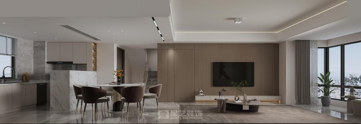 女业主是本人初中班主任,秉着对我的完全信任找到我。户型是叠墅的上叠,拥有三层,顶层为大露台。全屋几乎是根据效果图实景落地的,一楼开放式厨房,与客餐厅结合为一个大空间,一楼长辈房的门与电视背景墙结合,做隐形门,似有似无。三楼露台做一个封闭式休闲阳光房。