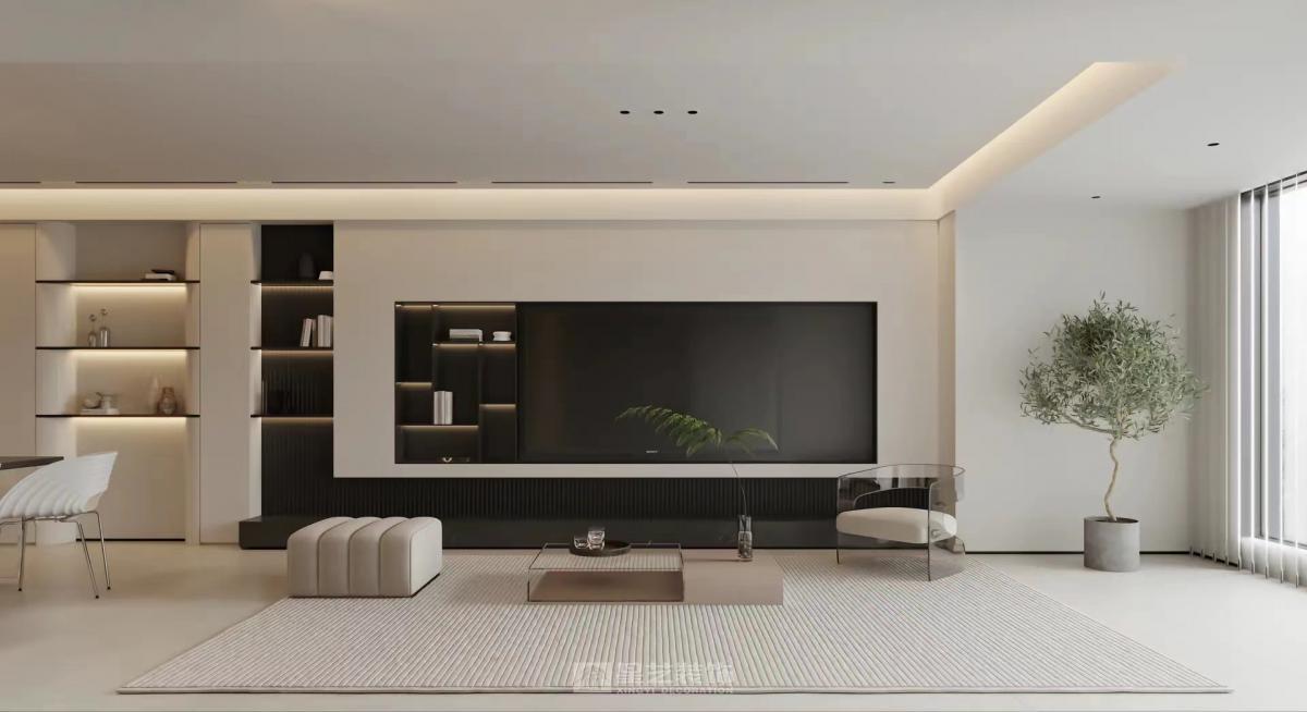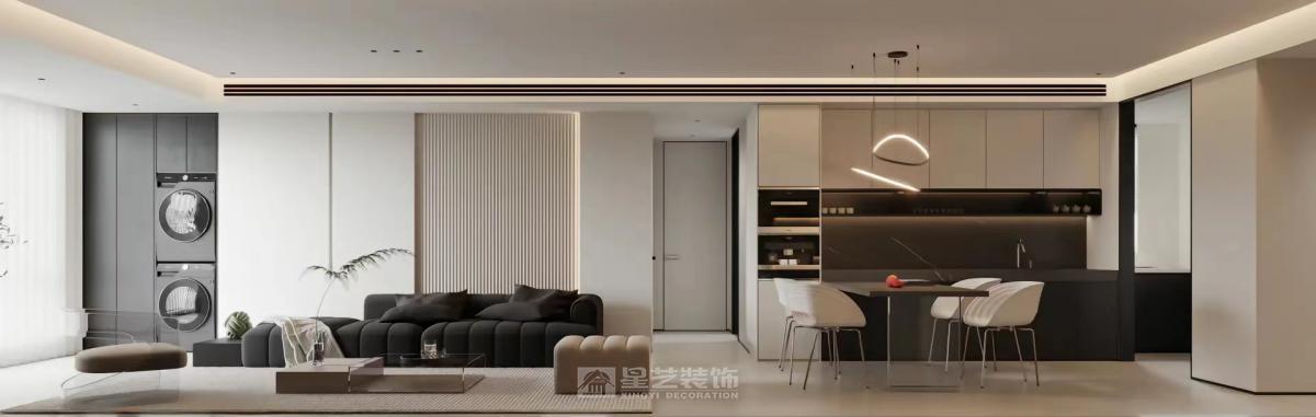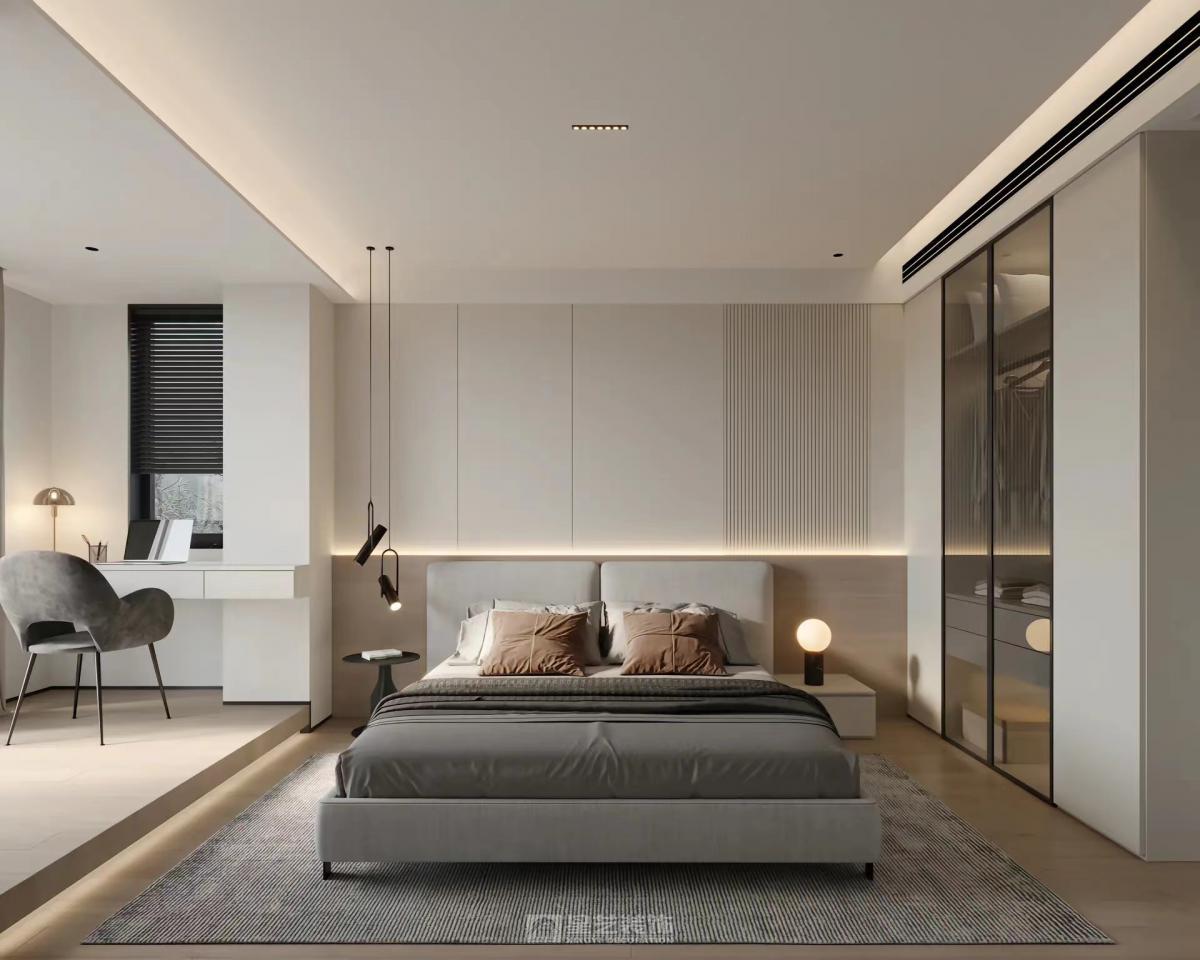 该房陈总一家三口居住,小孩已读高一,寄宿学校,只有周六日回家。原户型四房改为三房。陈太太现实生活中非常崇尚断舍离,是一位生活及精神上都很极简的女主。由于夫妻两人平时很忙,回到家想多一份温馨感。所以在该设计上去繁留简,颜色以浅咖色为主色调,同时在灯光上做了氛围灯光的营造,使空间简约而不简单,层次感拉满。