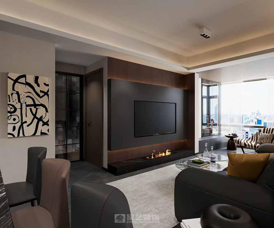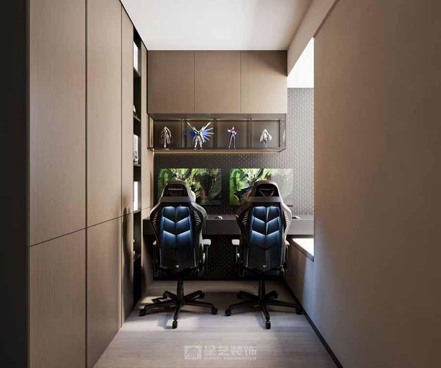 这套房子是作为婚房的 客户年龄段相对比较小 喜欢色彩对比度高 色彩感重 给客户推荐意式 客户看了也很喜欢 就朝着意式的方向 暂时就两个人居住 书房作为电竞房是他们关注的点 书房作为储物兼偶尔电竞的功能相结合 。。