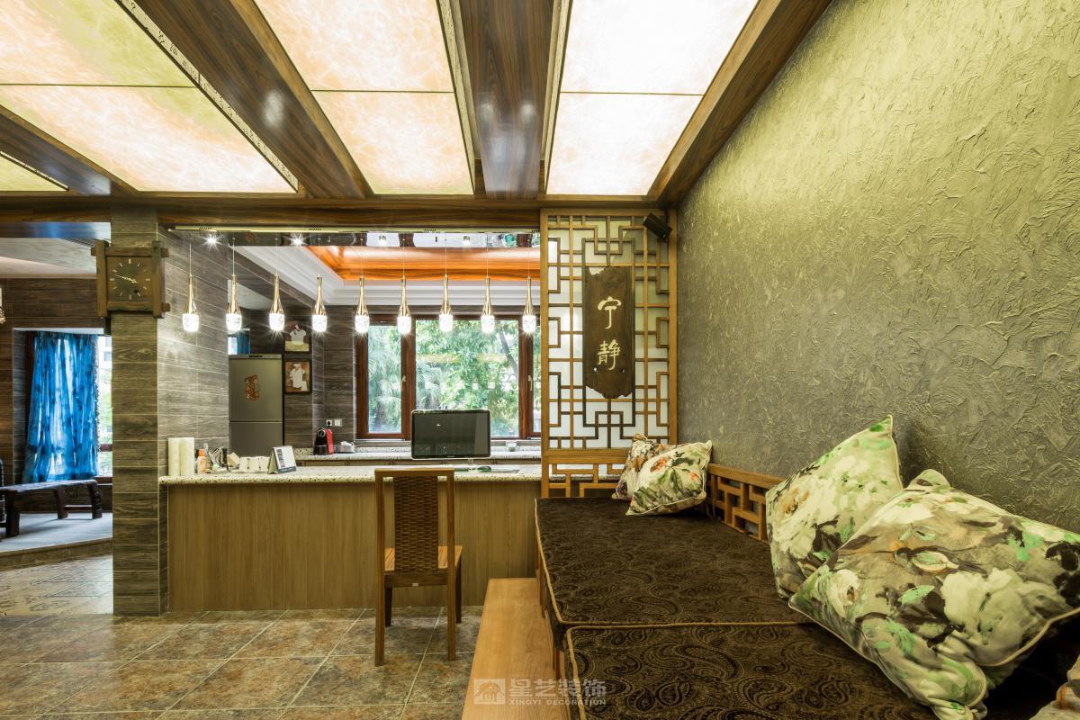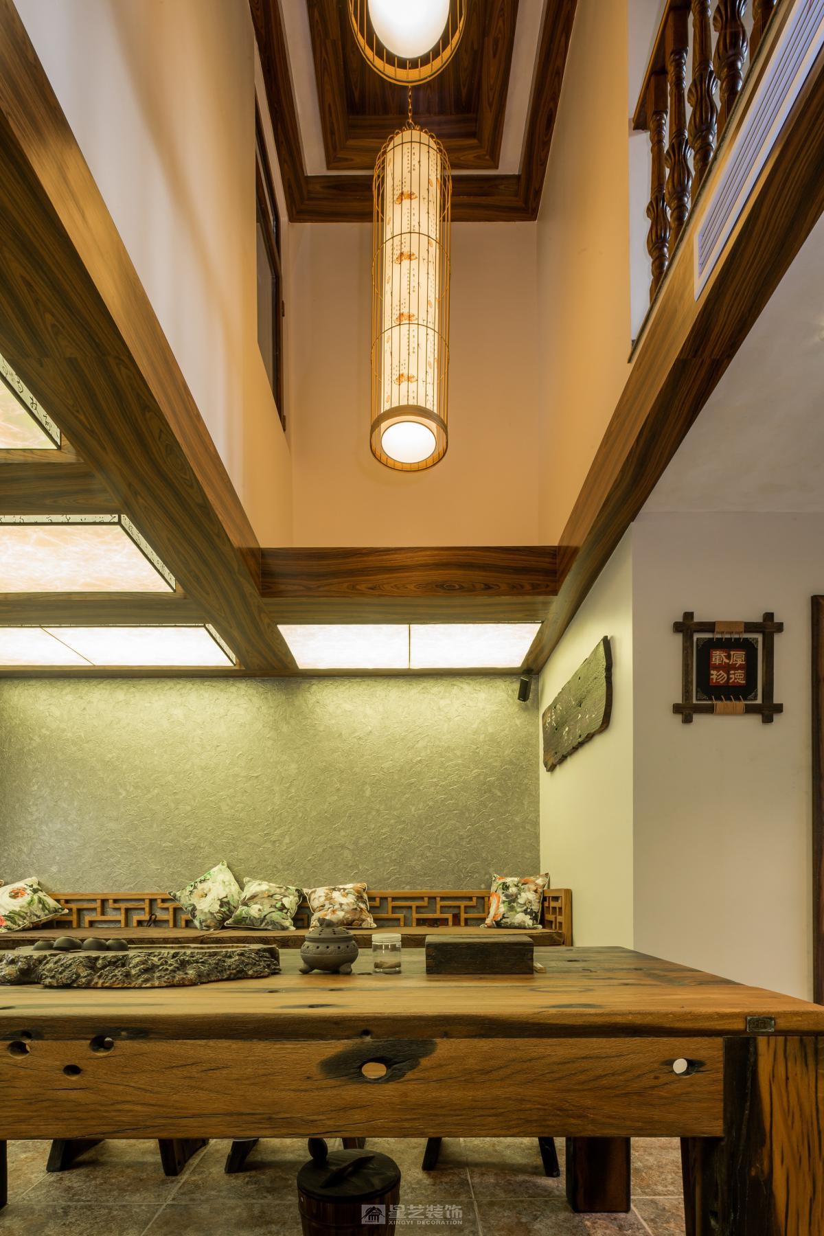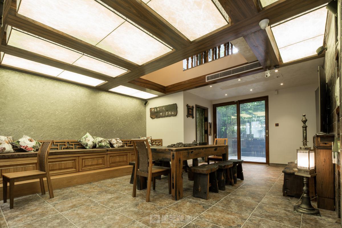 空间以木为魂。取原生古木为梁柱,展现榫卯结构的朴拙之力;辅以竹编、陶器点缀,于粗砺中见细腻。整体色调取原木褐、米白与靛青,似水墨浸润。檐下留隙,引天光树影入室,营造隐于自然的闲逸之境。