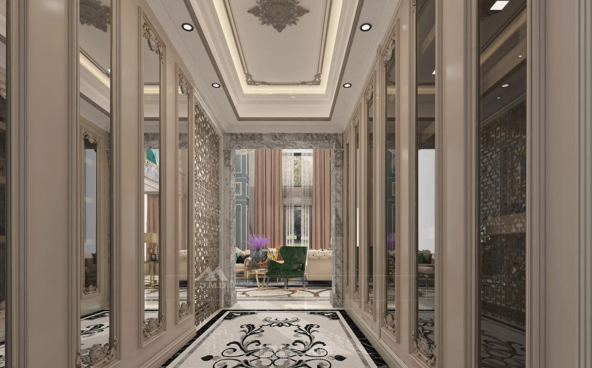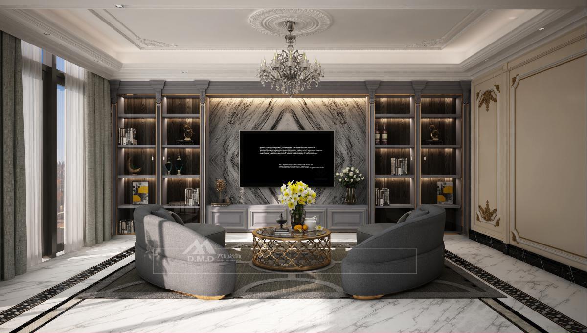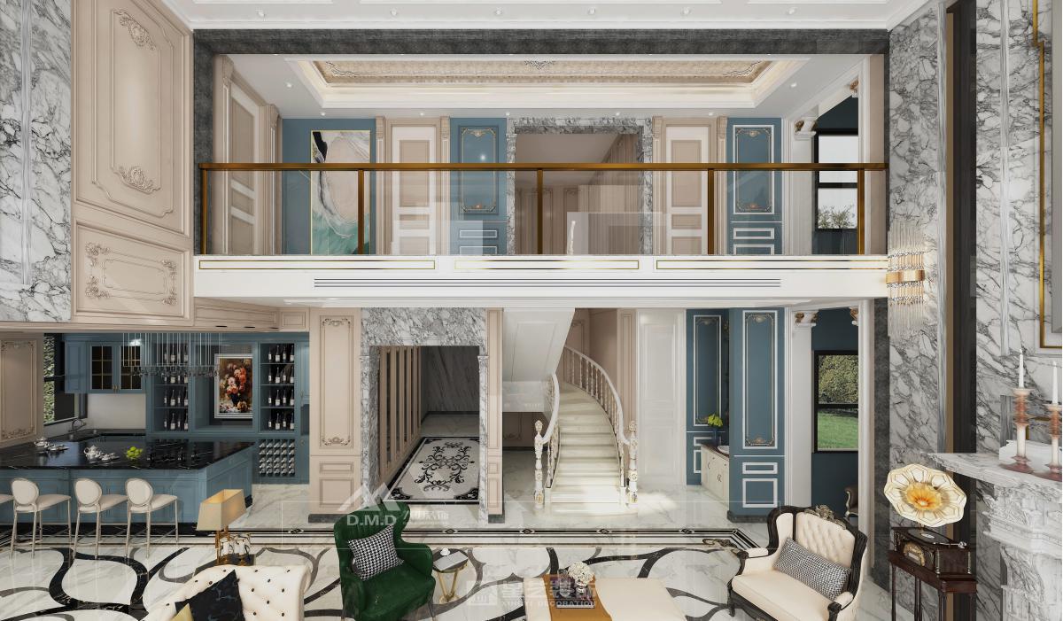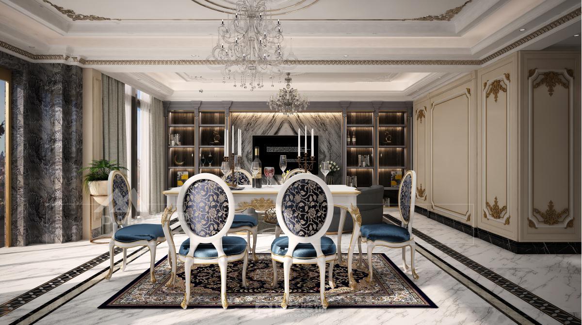 空间以珍珠白与浅金为基调,精细雕花线条勾勒墙面与天花。大型水晶枝形吊灯与壁灯呼应,光线经多处镜面折射,倍显璀璨。家具选用曲线柔美的天鹅绒材质,搭配洛可可式鎏金边几。细节处点缀手绘花卉与古典雕饰,整体营造浪漫典雅、轻盈奢华的法式宫廷氛围。