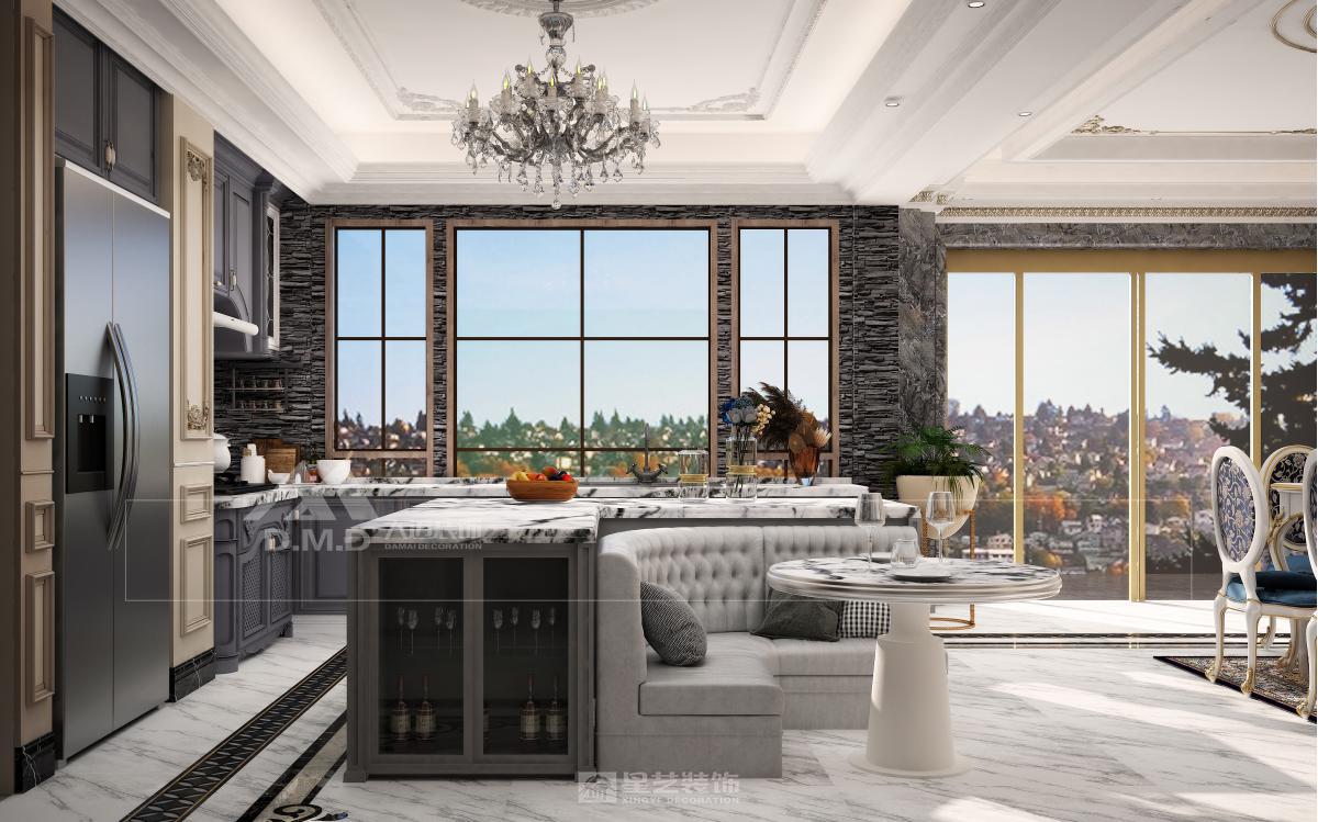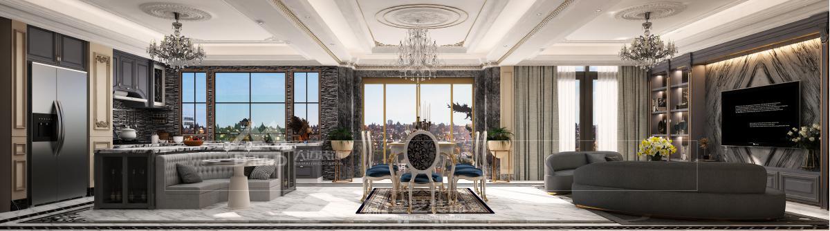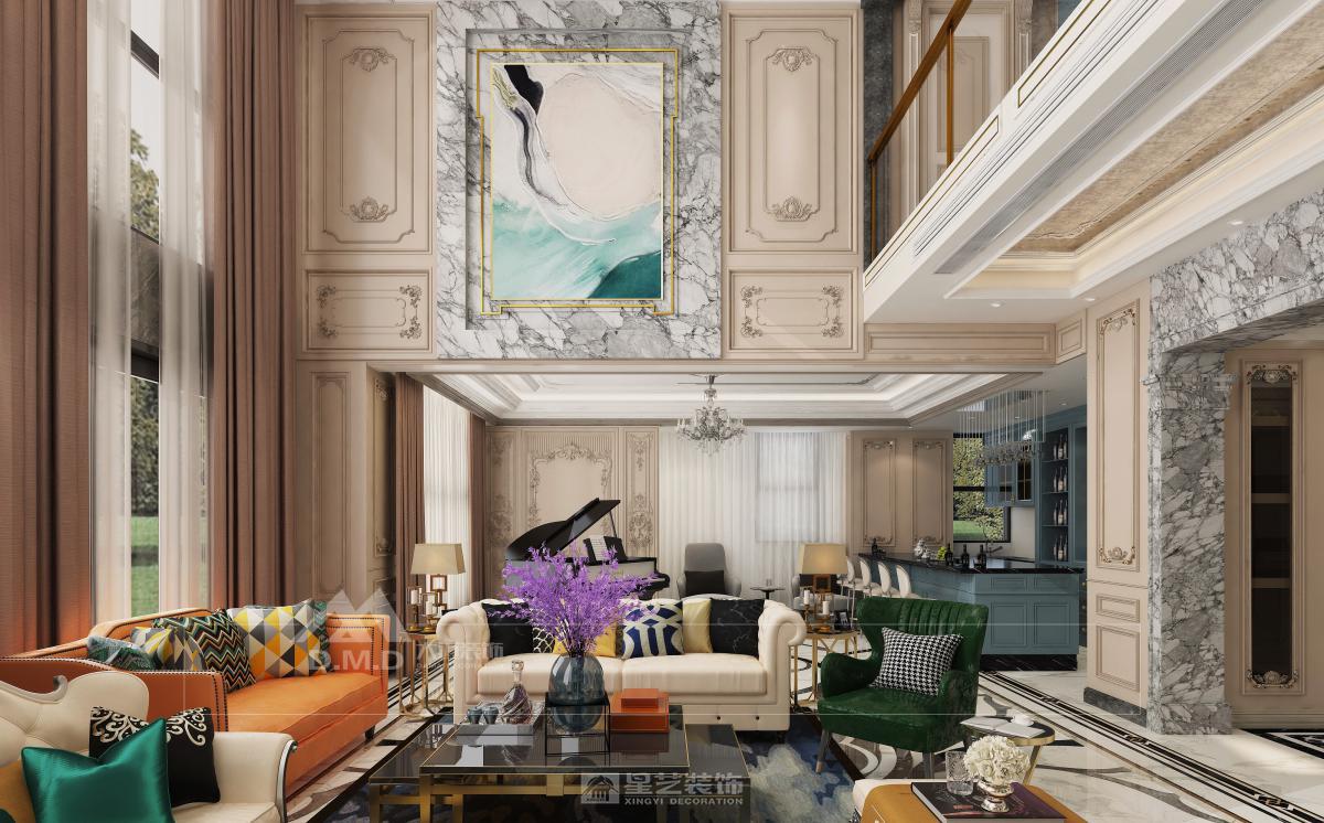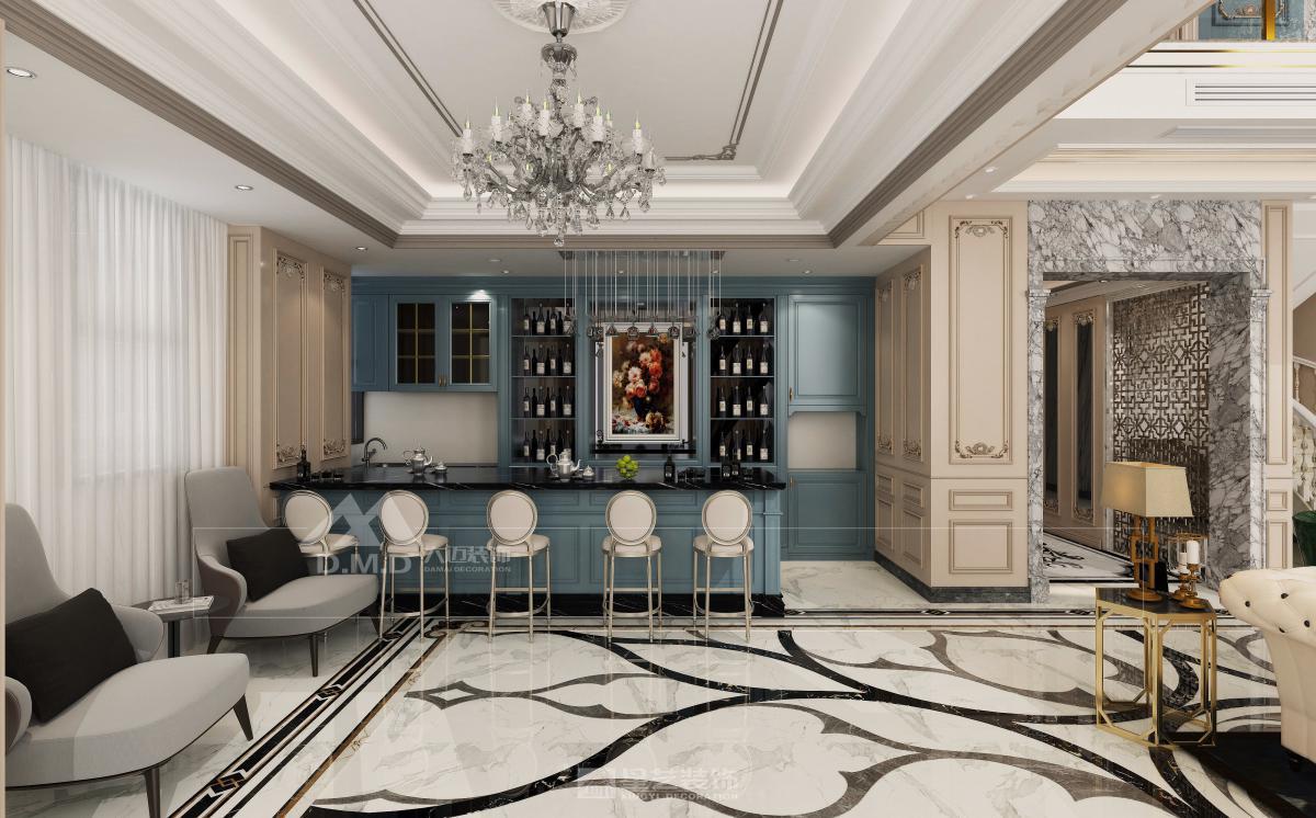 空间以珍珠白与浅金为基调,精细雕花线条勾勒墙面与天花。大型水晶枝形吊灯与壁灯呼应,光线经多处镜面折射,倍显璀璨。家具选用曲线柔美的天鹅绒材质,搭配洛可可式鎏金边几。细节处点缀手绘花卉与古典雕饰,整体营造浪漫典雅、轻盈奢华的法式宫廷氛围。