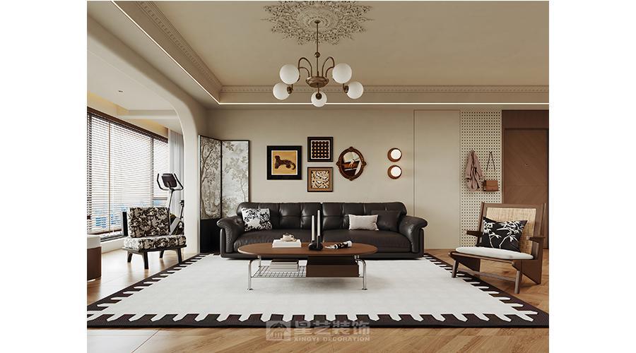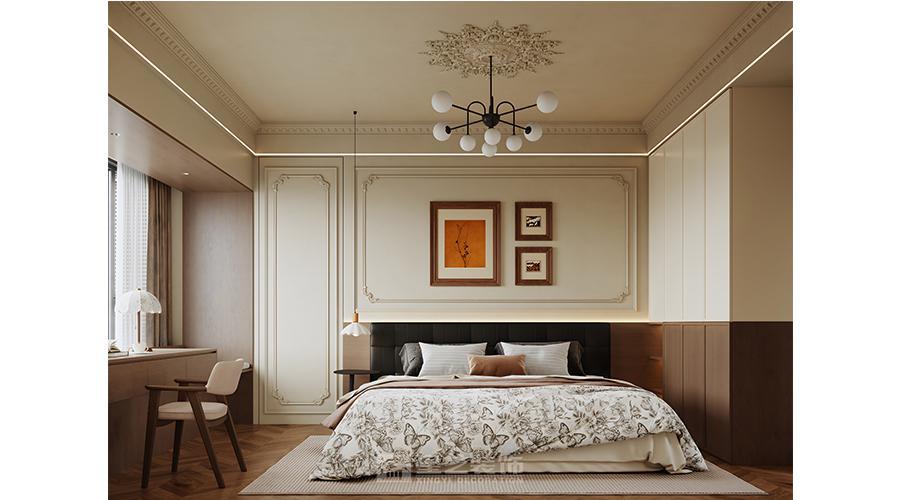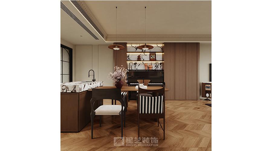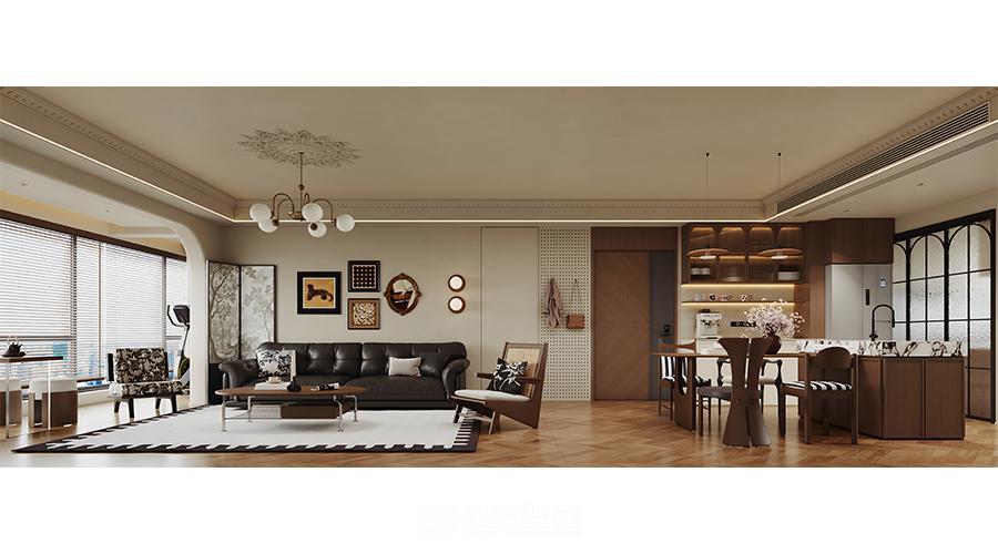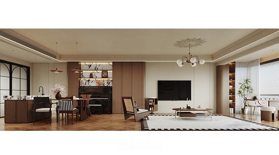 本空间以「复古与现代共生」为设计内核,将法式线条的优雅与现代简约的实用相融。深棕木调打底,搭配人字拼地板与石膏雕花顶,勾勒温润质感;大理石、长虹玻璃等材质碰撞,弱化空间边界。钢琴区与客餐厨一体化布局,在保留古典韵味的同时,用简洁的柜体、柔和的灯光营造松弛感,让复古风情落地于当代生活。
