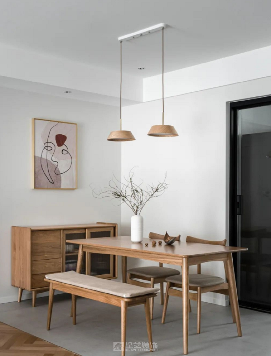 客厅采用开放式布局,并将阳台整体纳入,极大提升了空间的通透性与采光率,营造明亮而舒展的氛围。墙面选用艺术漆,搭配自然温润的木质元素,共同构建出层次丰富、细腻柔和的肌理质感。