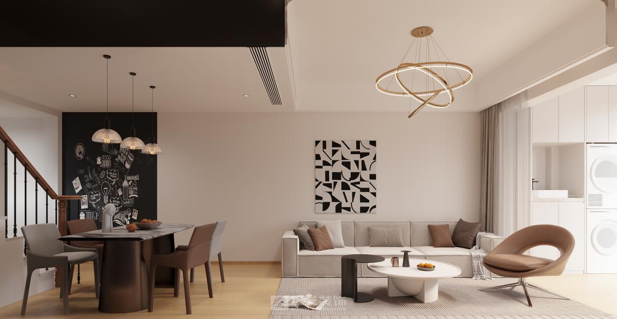 以米白、浅咖作为空间基底,奠定柔和温润的视觉基调;通过黑色、深棕的硬装线条与家具轮廓形成对比,搭配焦糖色、棕色的软装布艺做点缀,金色金属灯饰则为空间注入轻奢质感,色彩层次丰富且协调。