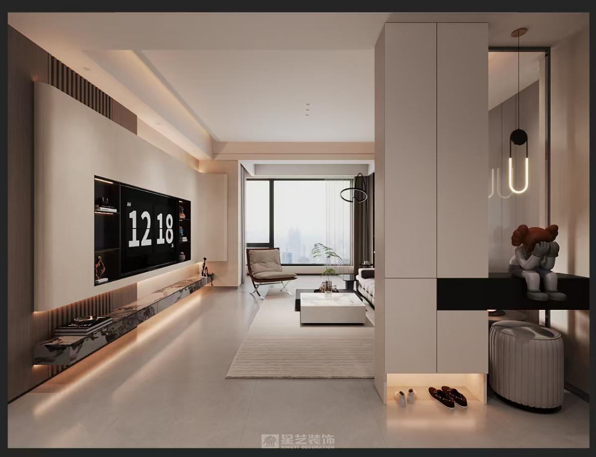 悬浮感设计:电视墙下方的地台结合线性灯光,让厚重的体量显得轻盈,是营造现代感的关键手法。 对称与平衡:电视背景墙的展示架、艺术品摆放均讲究对称,带来稳定、秩序的视觉感受。 艺术化点缀:黑白抽象挂画和几何装饰画,在不破坏整体简约调性的前提下,提升了空间的艺术格调。
