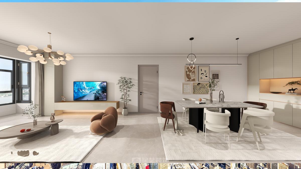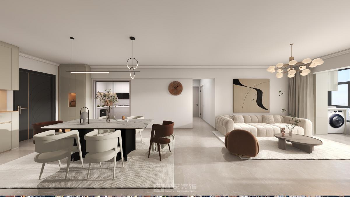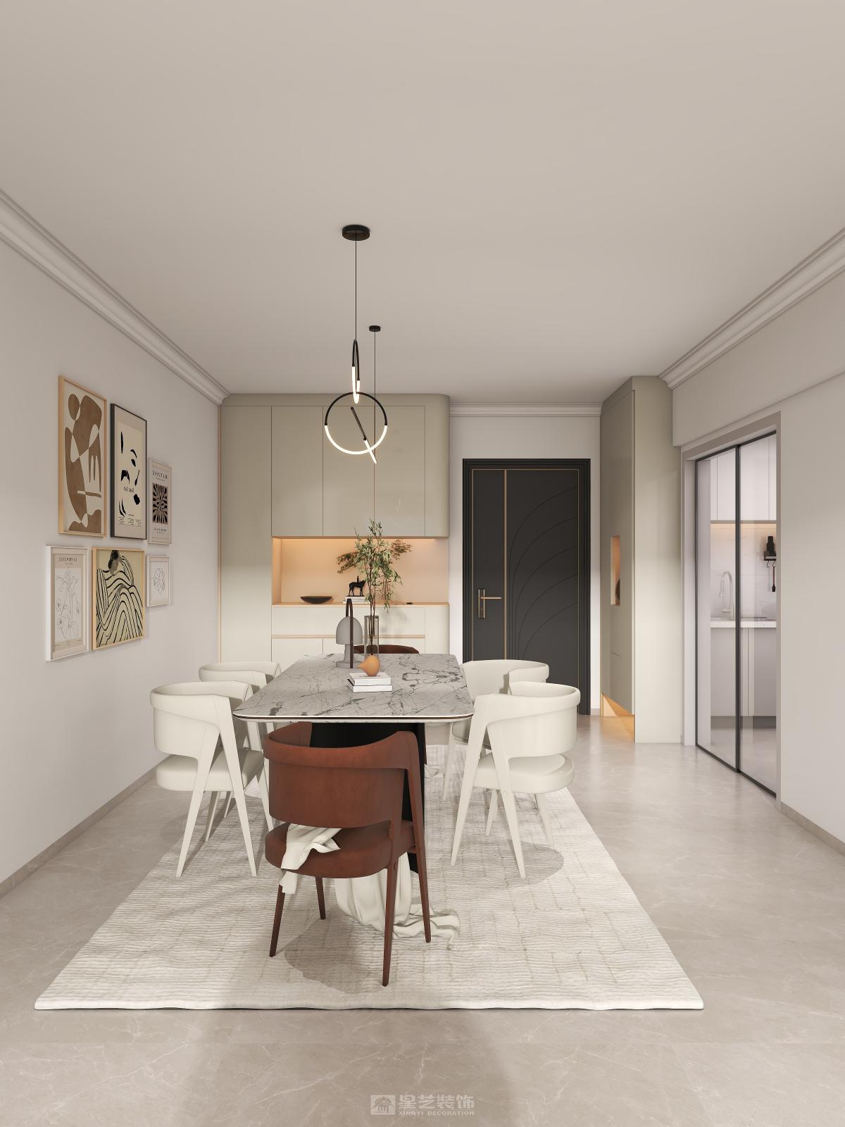 四人用餐区居于中央,四周的环形动线有利于生成最近的到达路径, 形式各异的餐椅则表达着业主不与众人同的喜好,一组吊灯之下,即便寻常的一日三餐,也变得意义深刻。