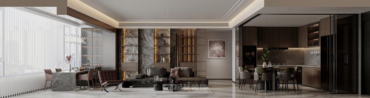 意式极简基底:以深灰、浅灰、米白为基调,搭配金属色点缀,线条利落,无冗余装饰,如悬浮吊顶、直线条沙发、几何造型灯具。 中式元素融入:通过材质(大理石、木质格栅)、色彩(墨色、赭石色)及软装(水墨画、对称摆件)传递东方意境,如背景墙大理石纹理、格栅式书架、抽象水墨装饰画。 空间布局:客餐厅一体化设计,开放式格局搭配中岛台,增强互动性与通透感,满足会客、用餐、休闲等多重需求。 材质与光影运用 材质碰撞:大理石背景墙与木质格栅形成冷暖对比,金属线条(吊灯、柜体拉手)提升精致度,布艺沙发与皮质餐椅平衡质感。 光影设计:大面积落地窗引入自然光,搭配线性吊灯、壁灯等多层照明,营造明暗有致的氛围,凸显材质肌理与空间层次。