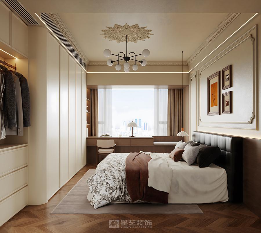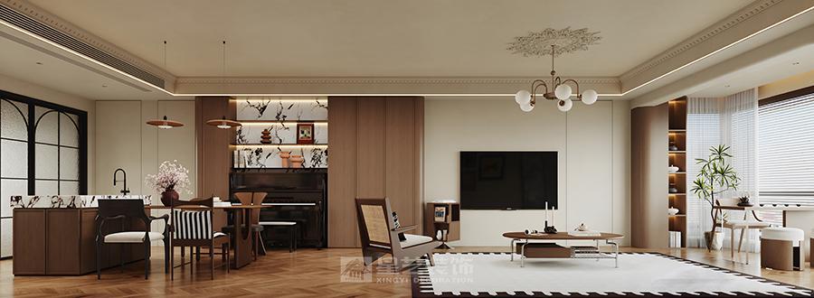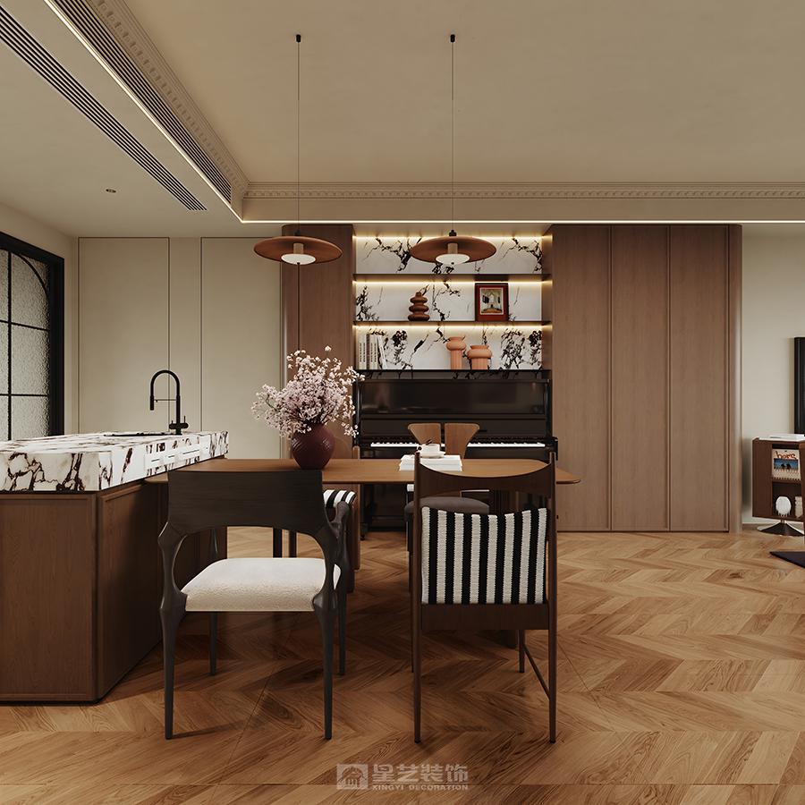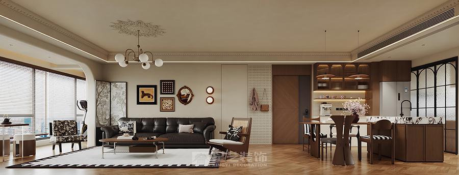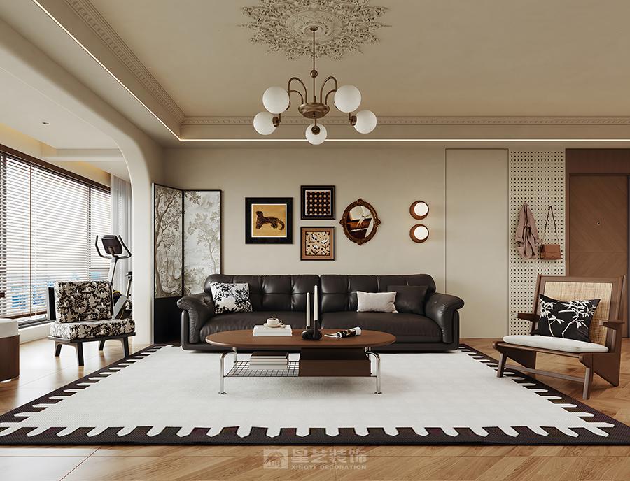 本设计以中古风为基调,融合现代美学与怀旧质感。空间采用开放式布局,客餐厨动线自然流畅。客厅以深棕皮沙发为核心,搭配几何造型吊灯、艺术挂画与藤编单椅,地面人字拼木地板呼应复古韵味;墙面石膏线、雕花细节彰显精致,黑白几何地毯提亮空间。餐厨区暖棕木质橱柜搭配玻璃柜门,中岛台兼顾实用与展示,餐椅的黑白条纹、藤编元素延续复古调性。百叶帘柔化光线,暖光照明营造温馨氛围,整体在复古情怀与现代舒适中达成平衡,塑造雅致且充满生活温度的居住场景。