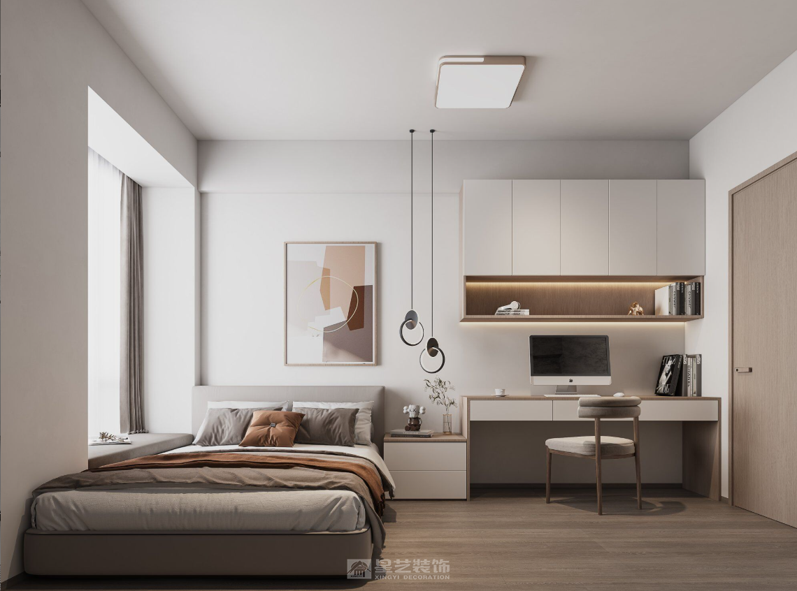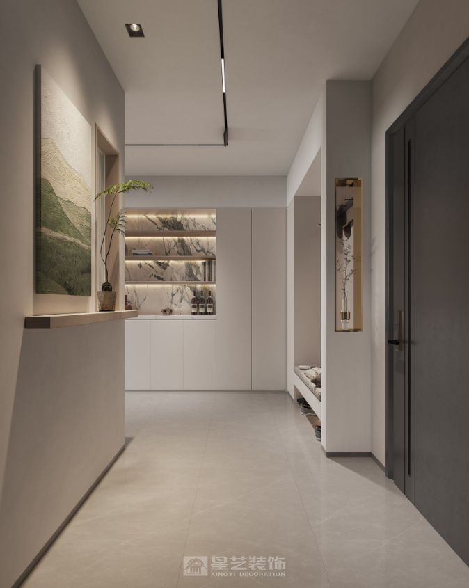 高度的统一性与连贯性: 色彩统一:全屋以白色、浅灰、浅木色为基调,局部用棕色、黑色、绿色点缀,色彩体系高度统一,视觉上和谐流畅。 材质对话:大量运用木材的温润、织物的柔软、皮革的质感、陶瓷的精致,并在多处(如柜体墙、餐厅)形成巧妙对比,丰富了空间层次。 功能与美学的完美融合: 每一处设计都兼具实用与美观。如多功能柜体墙是收纳与展示的杰作;过道的展示柜解决了狭长空间的枯燥感;次卧的一体化书桌最大化利用了空间。 光影塑造空间灵魂: 全屋注重自然光与人造光的结合。大窗户引入天光,筒灯提供均匀基础照明,重点照明(展示柜灯光、书架内嵌灯)突出装饰品,装饰性吊灯(卧室圆环吊灯)营造氛围,共同塑造了宁静、柔和、富有层次的光环境。 东方意境的现代转译: 不是简单的符号堆砌,而是将东方美学中“留白、写意、自然”的精神内核融入现代设计。山水画的运用、格栅元素的点缀、以及整体空间所传递的宁静禅意,都体现了这一点。