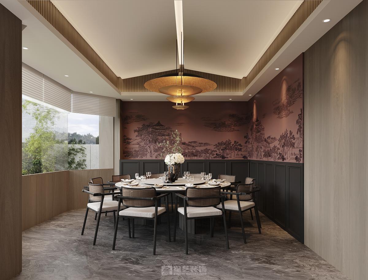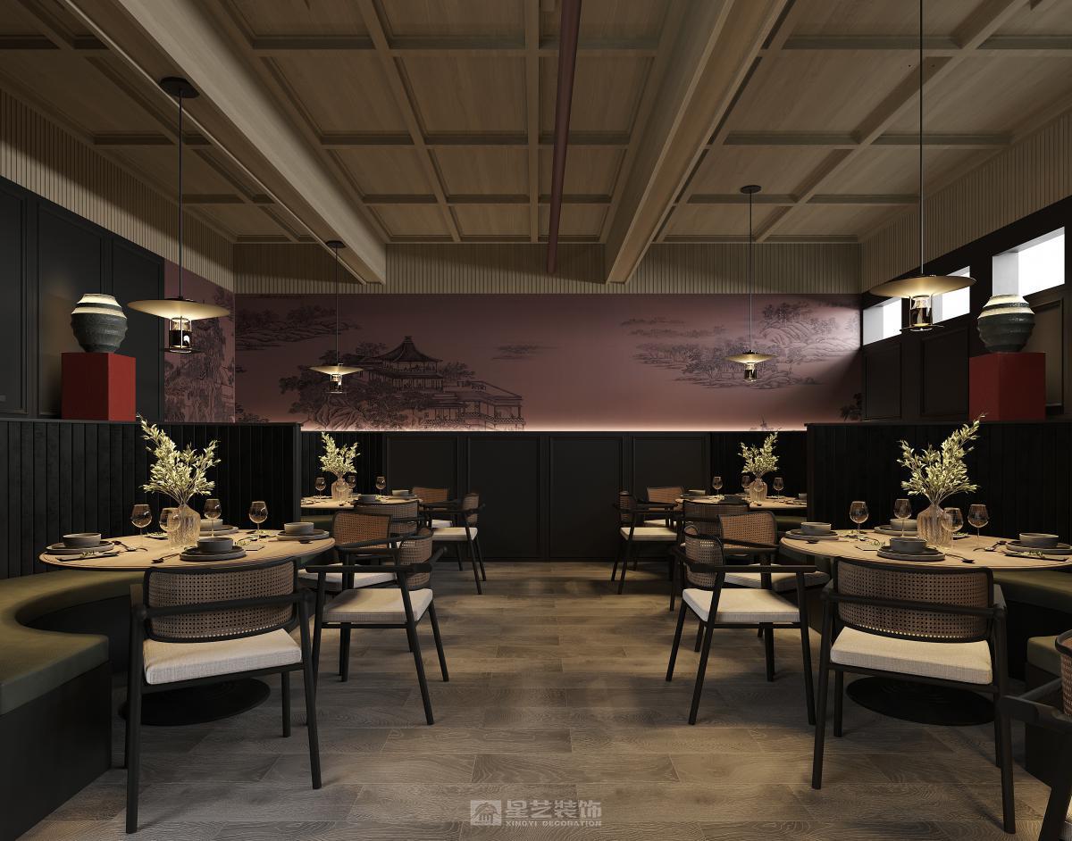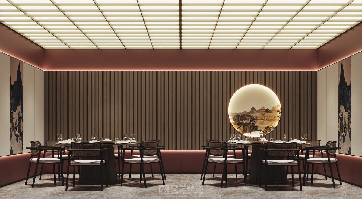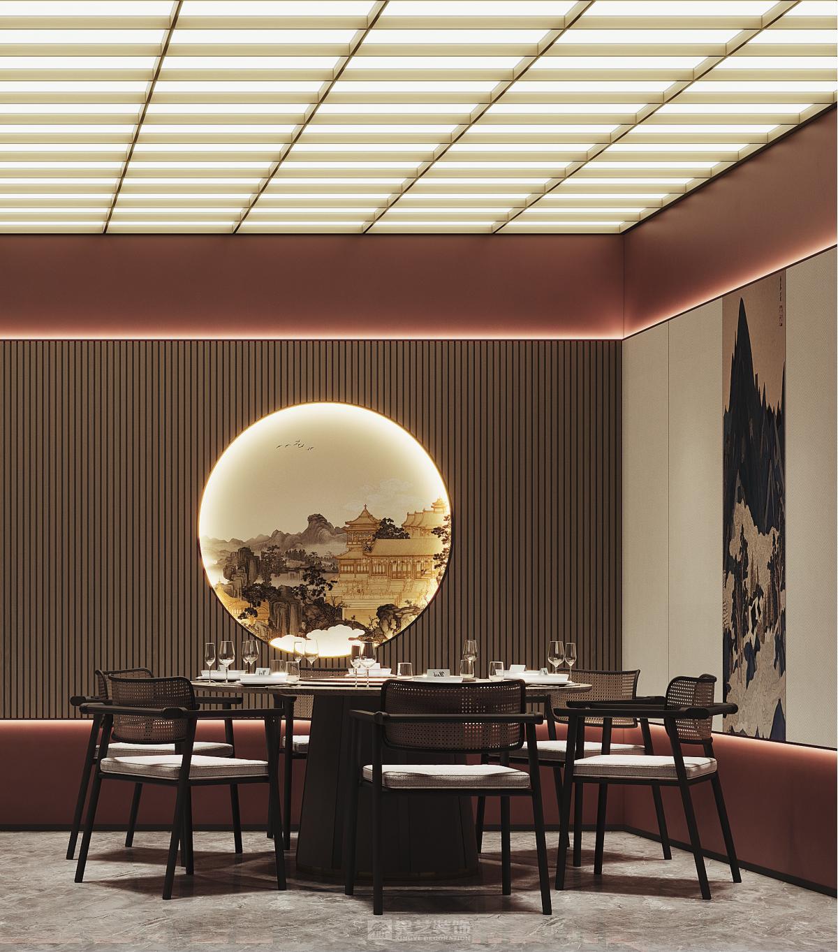 本餐厅以新中式风格为基底,融合东方美学与现代设计语言。深木色格栅、古意山水壁画勾勒出江南园林的雅致意境,豆沙红墙面与黑色金属线条碰撞,平衡了传统的厚重与现代的利落。藤编座椅、圆形餐台延续中式团圆理念,灯光与软装的细节铺陈,让食客在现代空间中沉浸式感受东方饮食文化的诗意与仪式感。