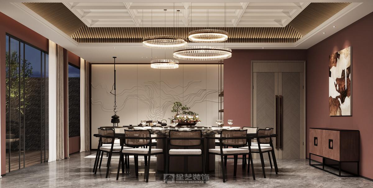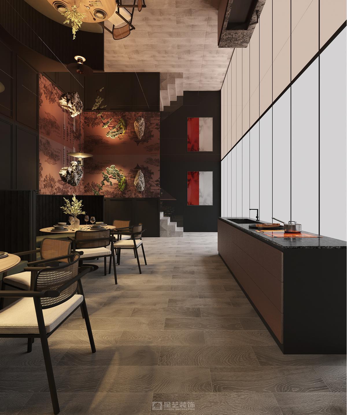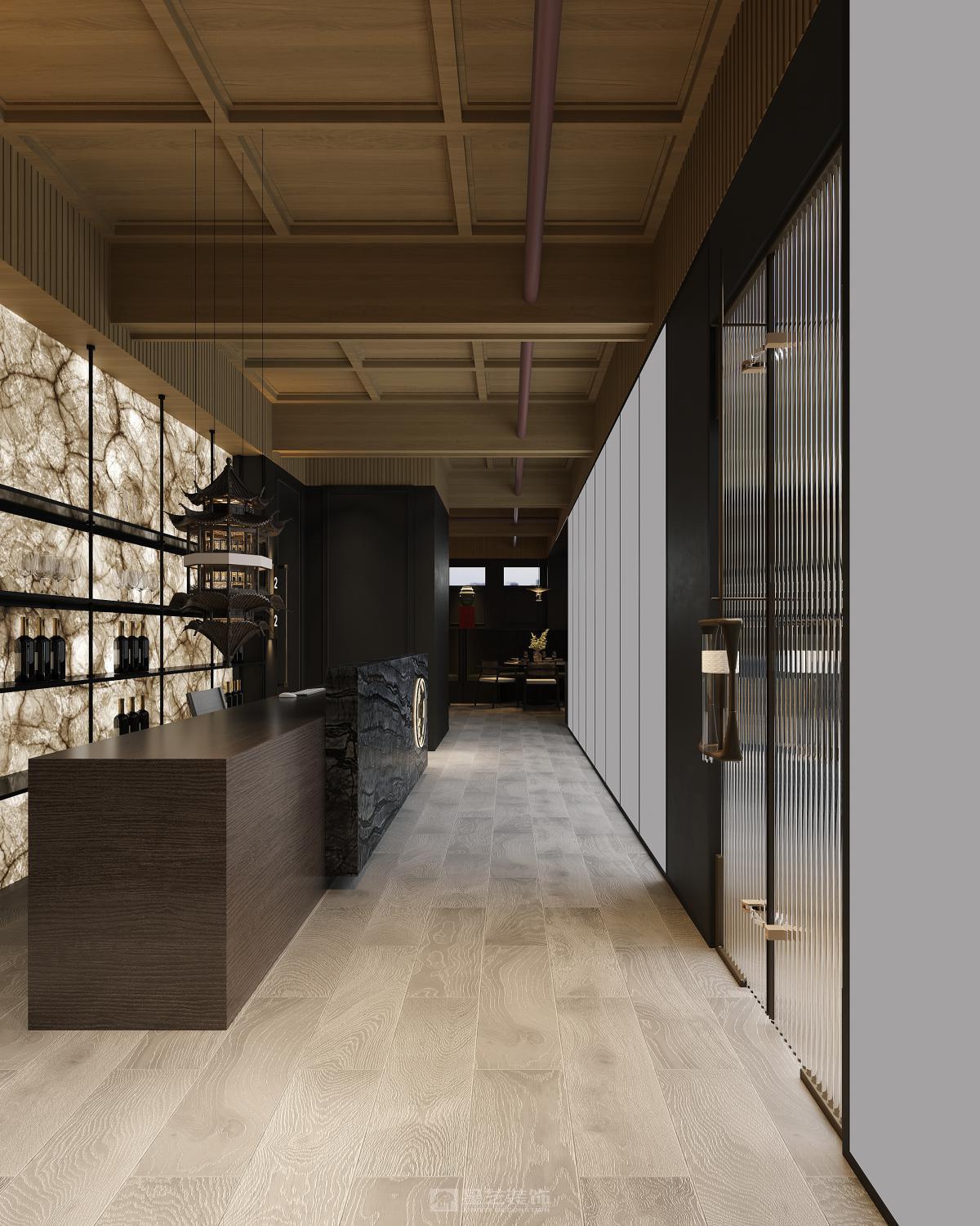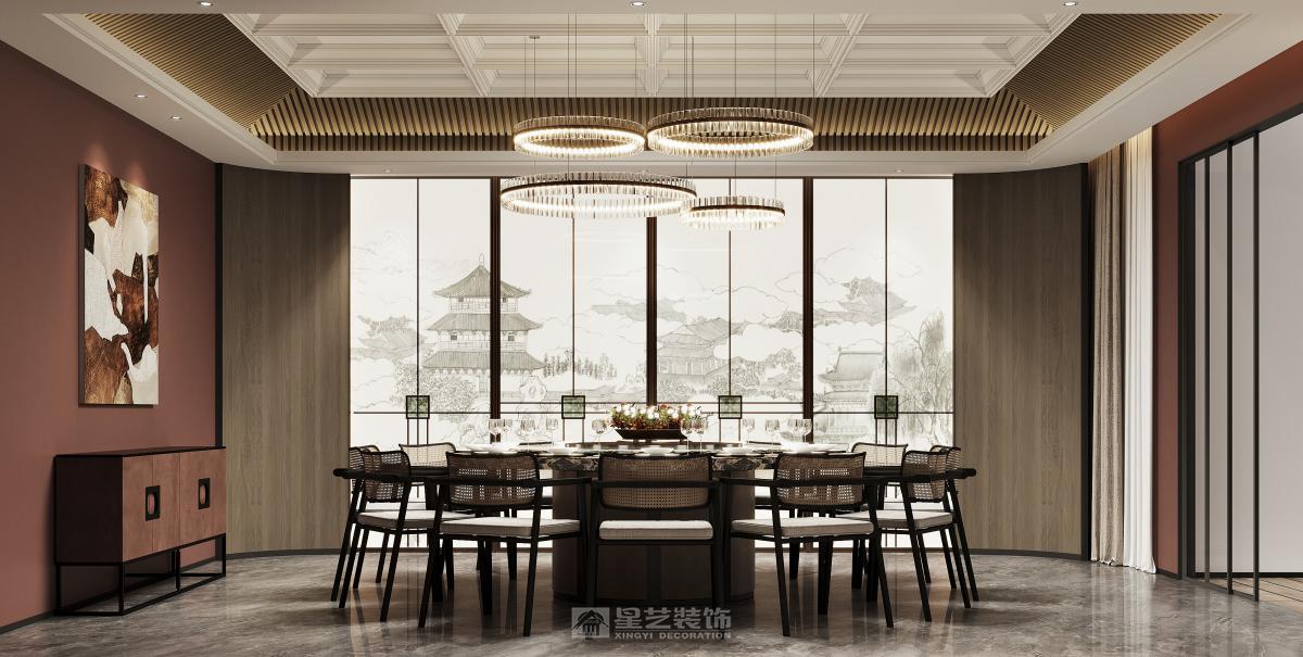 本餐厅以新中式风格为基底,融合东方美学与现代设计语言。深木色格栅、古意山水壁画勾勒出江南园林的雅致意境,豆沙红墙面与黑色金属线条碰撞,平衡了传统的厚重与现代的利落。藤编座椅、圆形餐台延续中式团圆理念,灯光与软装的细节铺陈,让食客在现代空间中沉浸式感受东方饮食文化的诗意与仪式感。