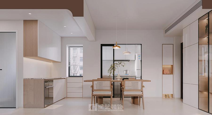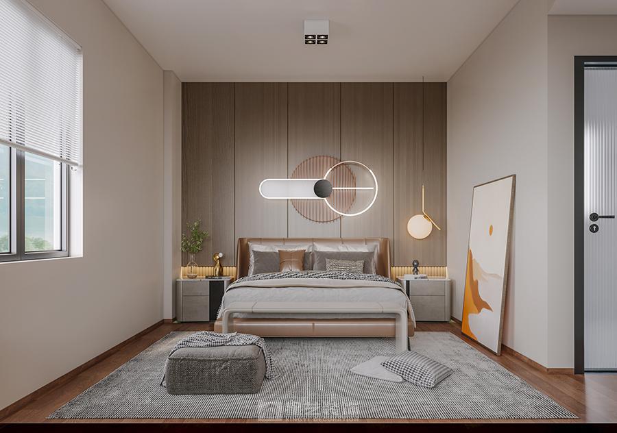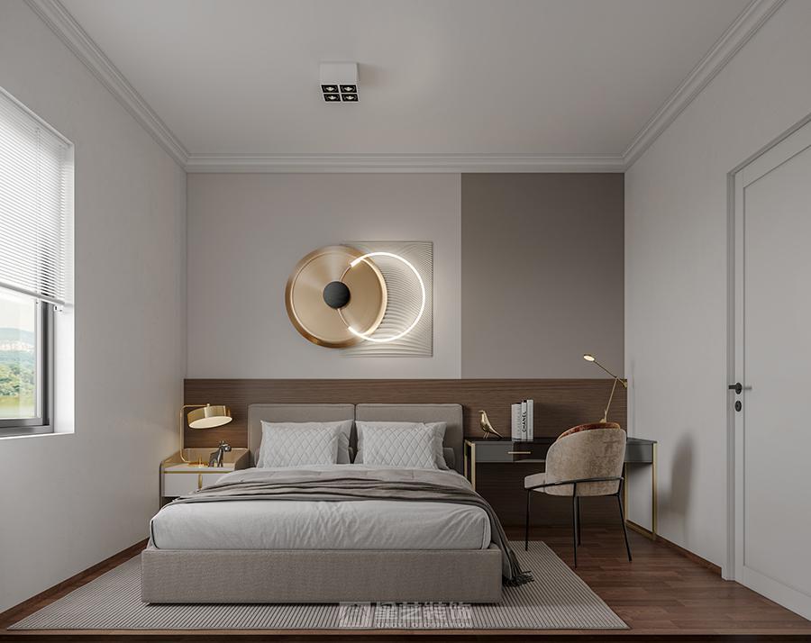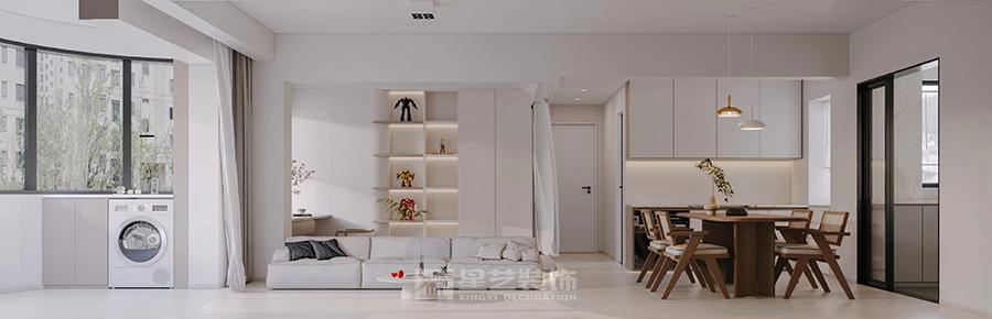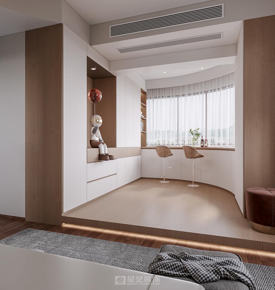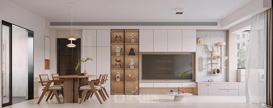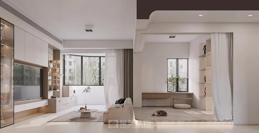 本案以现代简约风格为核心,用低饱和色调与简洁线条打造舒适宜居空间。整体以暖白为主调,搭配原木质感,营造温柔治愈氛围。空间采用开放式布局,客厅与休闲区自然衔接,增强通透感;大落地窗引入充沛自然光,分层窗帘(纱帘+布帘)兼顾柔化光线与隐私保护。定制柜体整合收纳与展示功能,电视墙嵌入猫爬架,彰显宠物友好理念;右侧地台区结合悬浮书架、矮榻,实现休憩与储物双重需求。无主灯设计搭配柔和光影,让简约空间更具温度与层次,在满足实用功能的同时,传递生活的松弛美学。