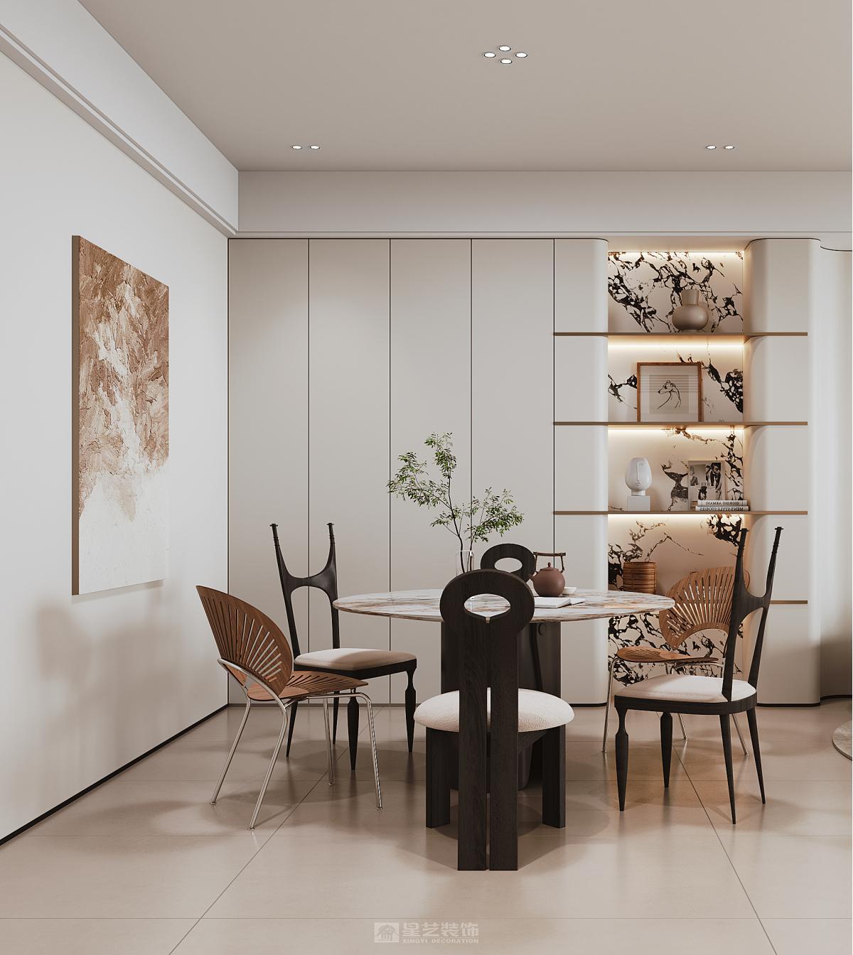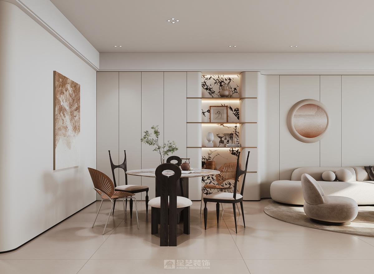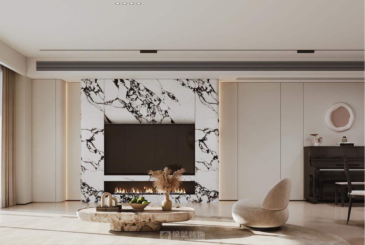 本空间以轻奢风格为核心,将精致质感与简约美学相融。雪花白大理石背景墙勾勒出大气的视觉焦点,内嵌壁炉增添温馨氛围;奶油色弧形单人椅、天然石材茶几柔化空间线条,黑色钢琴与艺术挂饰则作为轻奢点缀。整体在材质的碰撞与细节的雕琢中,营造出优雅且富有格调的现代居住体验。