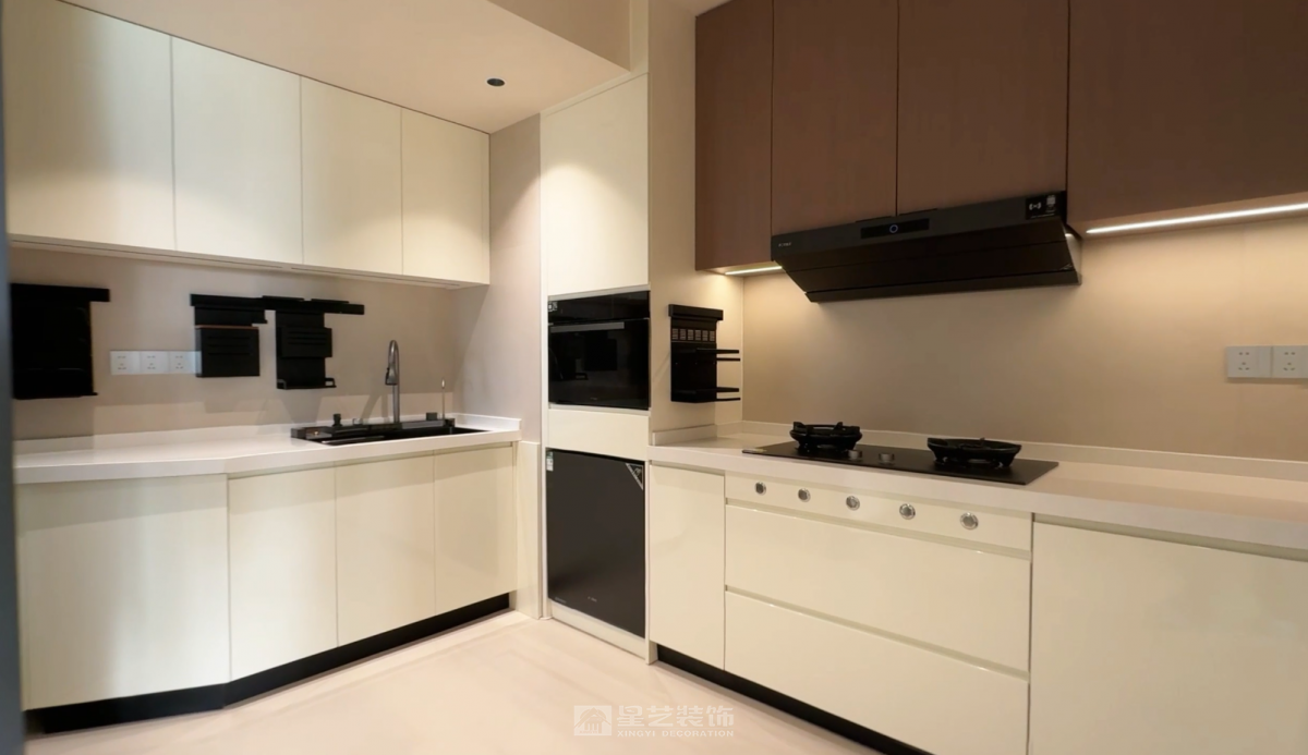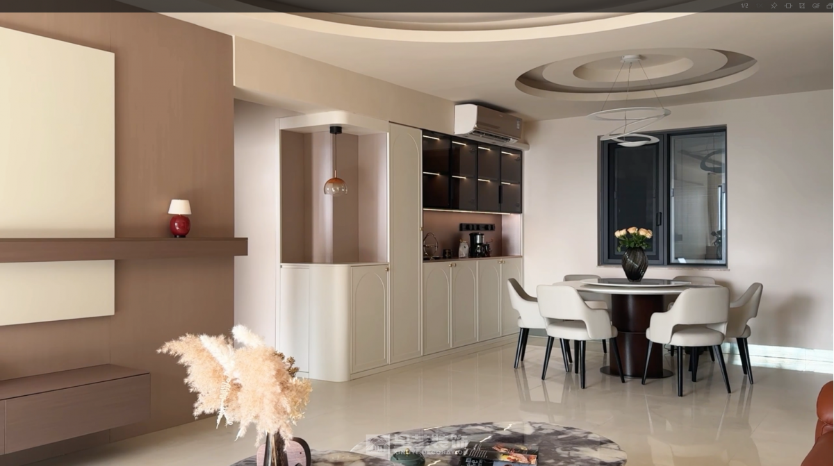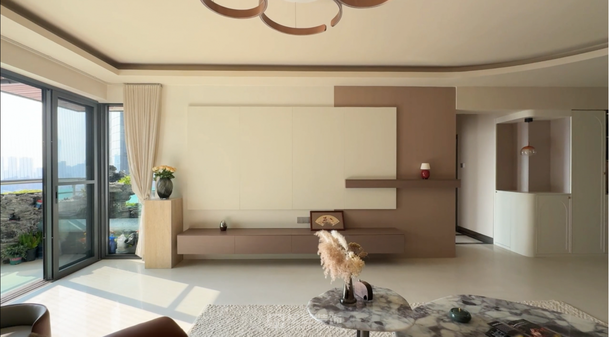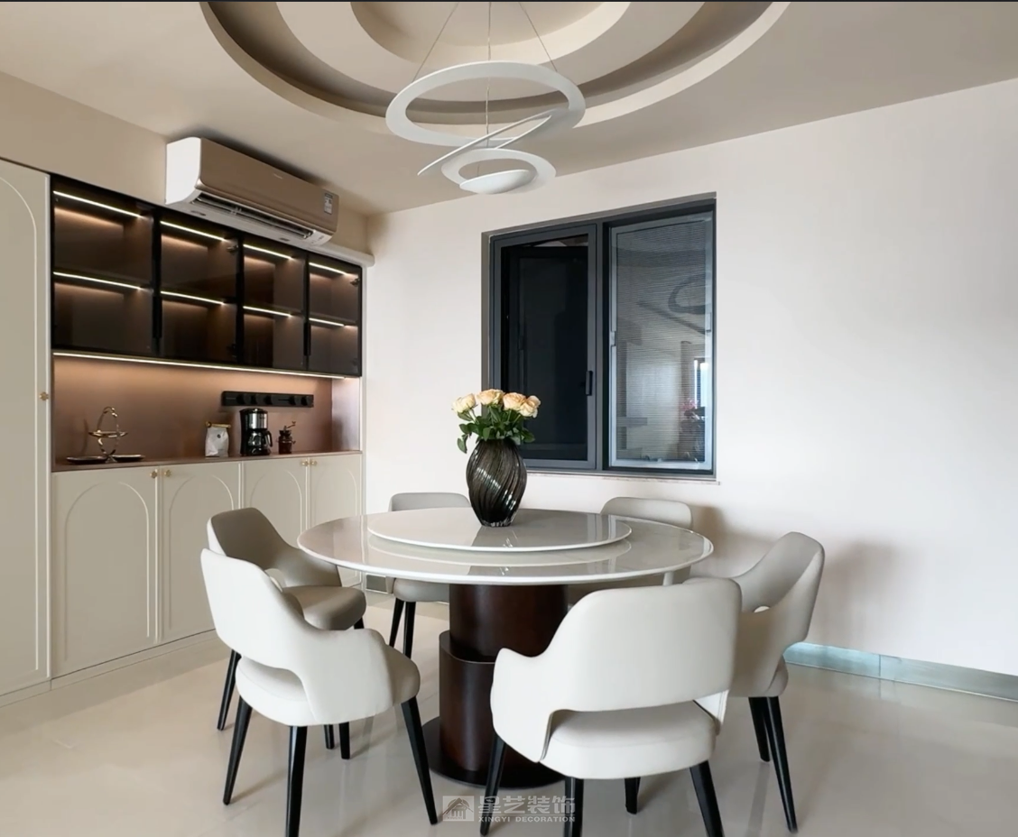 本案以现代风格为核心,打造客餐厨一体的通透空间。客厅浅色大理石茶几配米色地毯,弧形吊顶柔化边界;餐厅圆形餐桌围合六把白椅,餐边柜黑玻门藏巧思,多圆环吊灯点睛。厨房L型布局,白色和木纹色撞色橱柜利落实用。整体以浅调为基,红花瓶、竹纹墙背景墙等细节点缀,刚柔并济,营造温馨而不失格调的现代生活场景,满足了一家子三代同堂的居住需求。