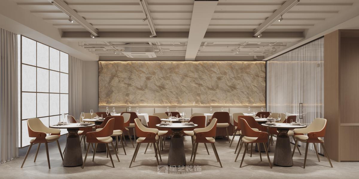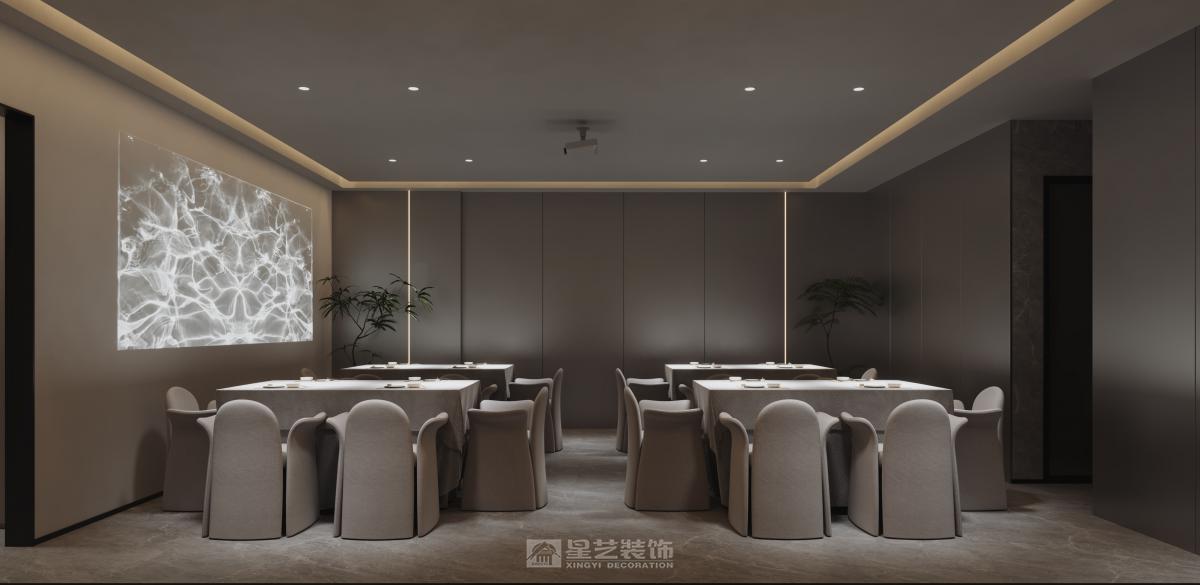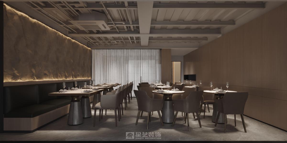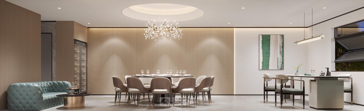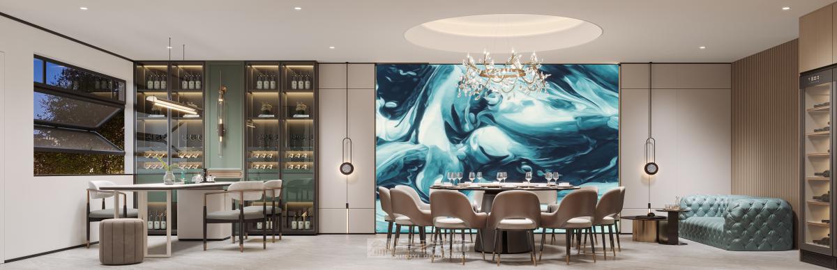 运用深色木饰面、香槟金属与天然石材,以弧形线条与柔光营造精致氛围。艺术酒柜与重点照明聚焦餐区,构筑兼具现代仪式感与私密优雅的用餐体验。