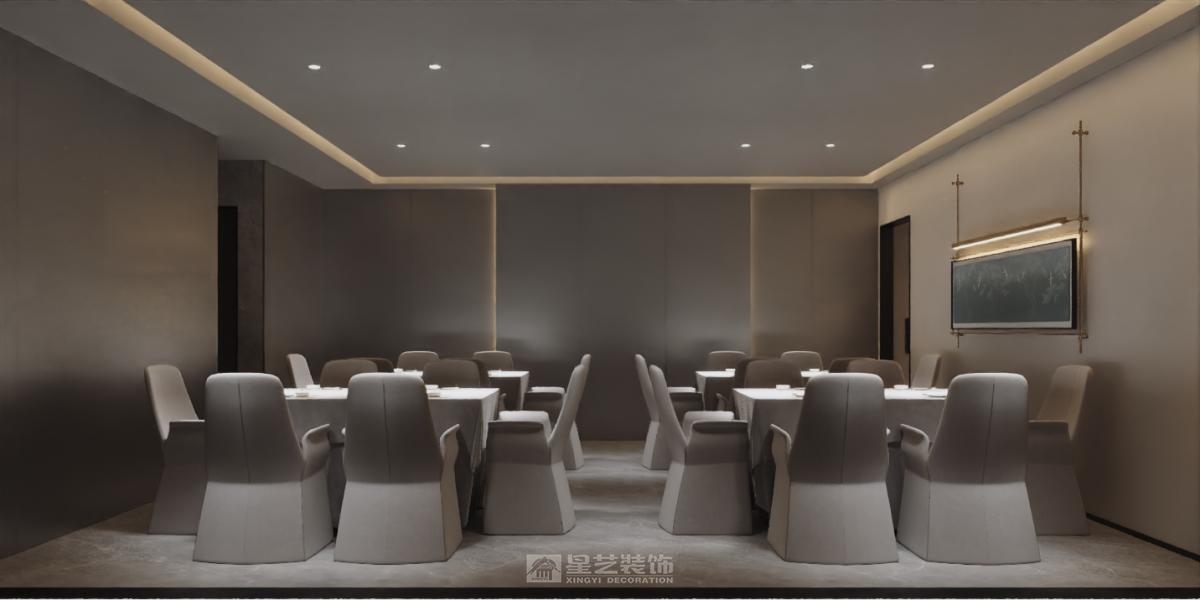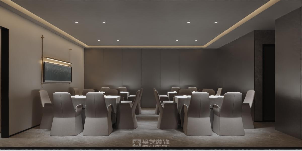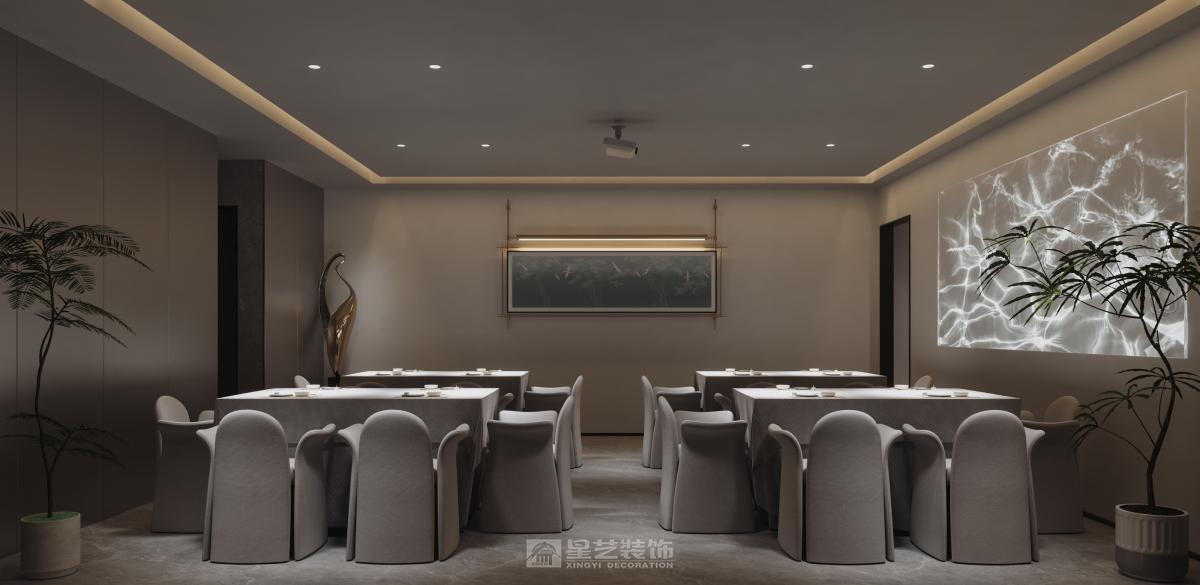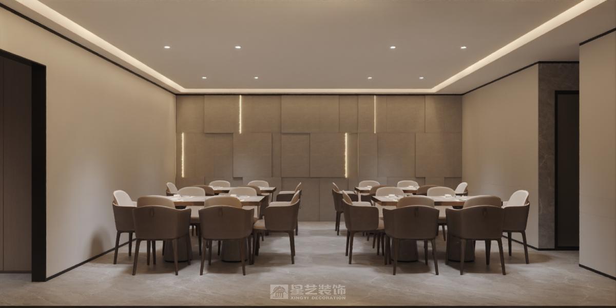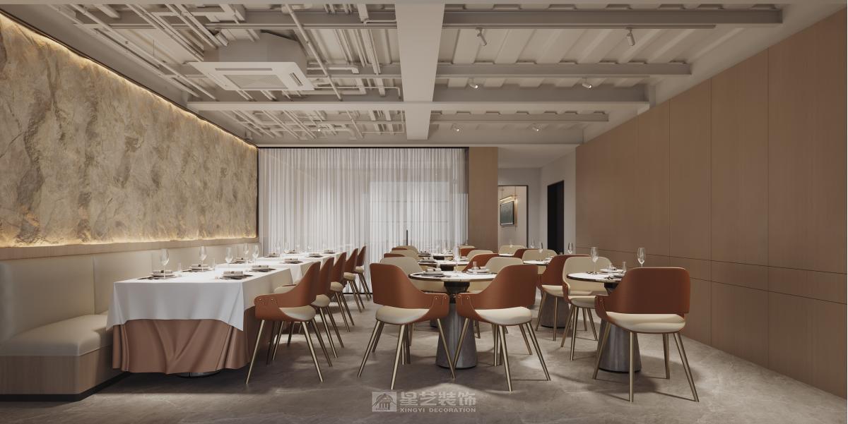 运用深色木饰面、香槟金属与天然石材,以弧形线条与柔光营造精致氛围。艺术酒柜与重点照明聚焦餐区,构筑兼具现代仪式感与私密优雅的用餐体验。