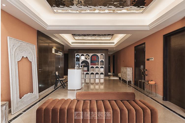 美容院以轻奢艺术为设计内核,将暖橘色墙面与金属质感顶面相融,营造温柔又精致的氛围。几何造型的展示柜打破空间沉闷,流线型接待台兼具功能性与美学感,复古雕花镜框与现代软装碰撞,让艺术肌理渗透每个角落,打造出兼具体验感与视觉张力的美护空间。