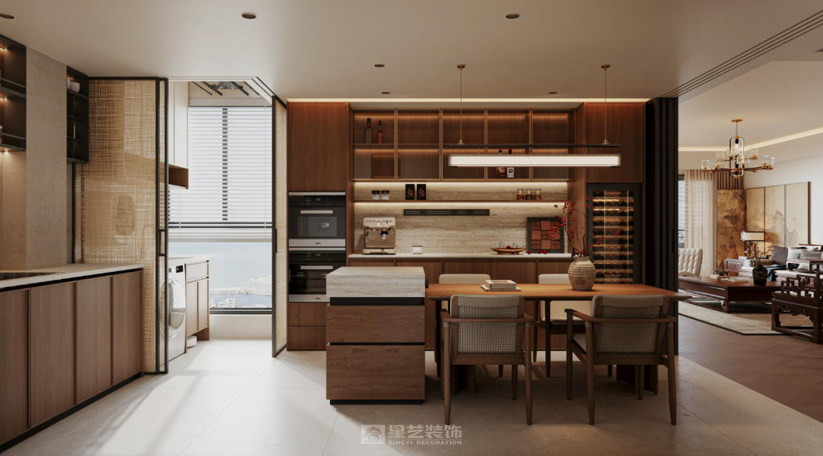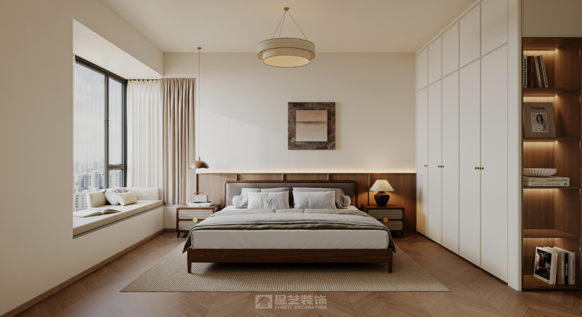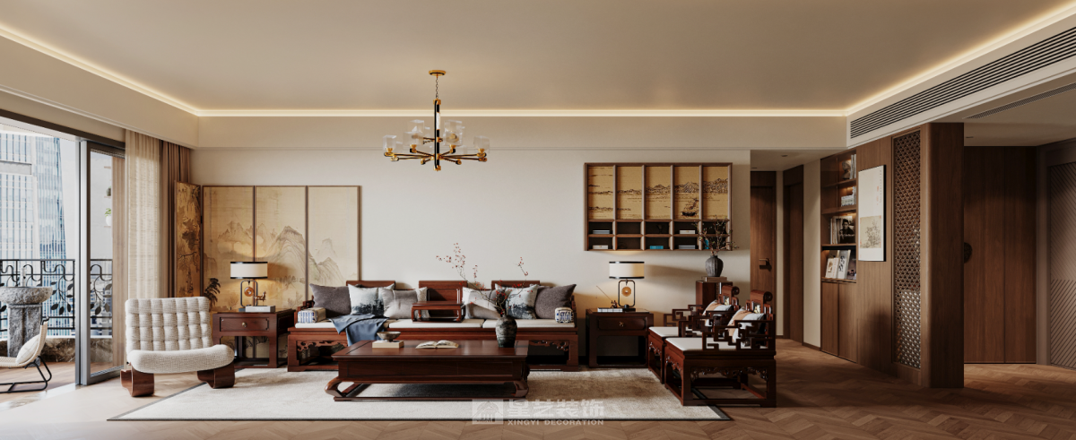 本案整体以现代中式为主基调 没有复杂吊顶,没有繁复雕花 干净利落的硬装配上温润原木 软件家具结合中式元素点缀