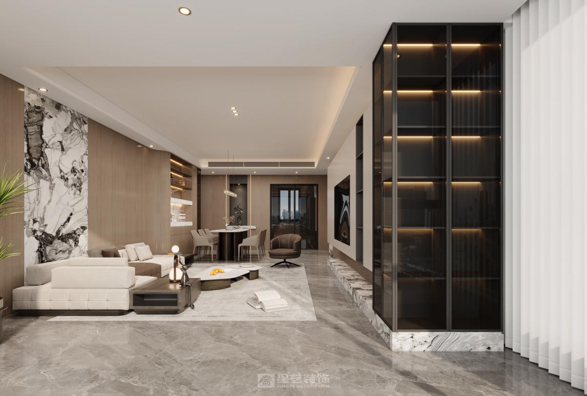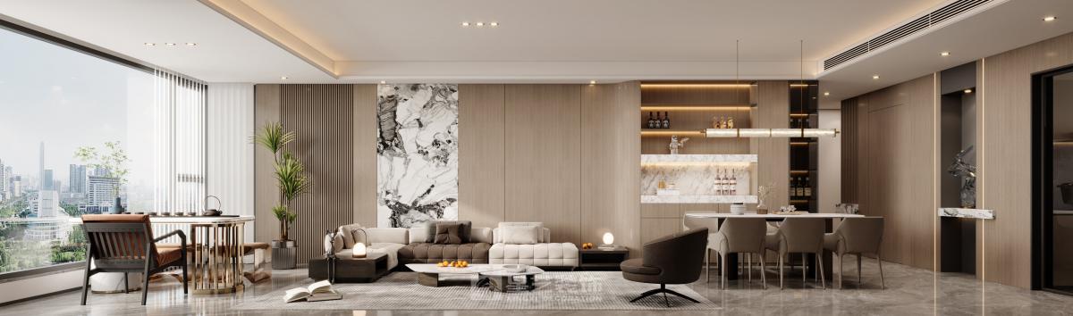用,营造低调奢华、简约有格调的现代居所。 软装走温柔现代风,弱化黑白灰的冷硬感,以米白、浅灰、奶咖为基底,局部用雾霾蓝、浅豆沙提亮。材质选用软糯布艺、木纹板材、哑光金属,家具线条柔和简约,软装搭配清新绿植、简约装饰画、柔和布艺软饰,删繁就简,打造温润舒适、简约不冰冷的现代宜居空间。