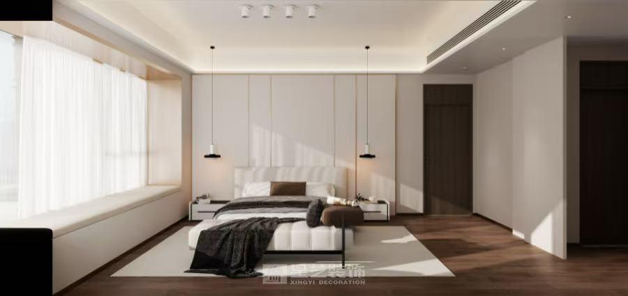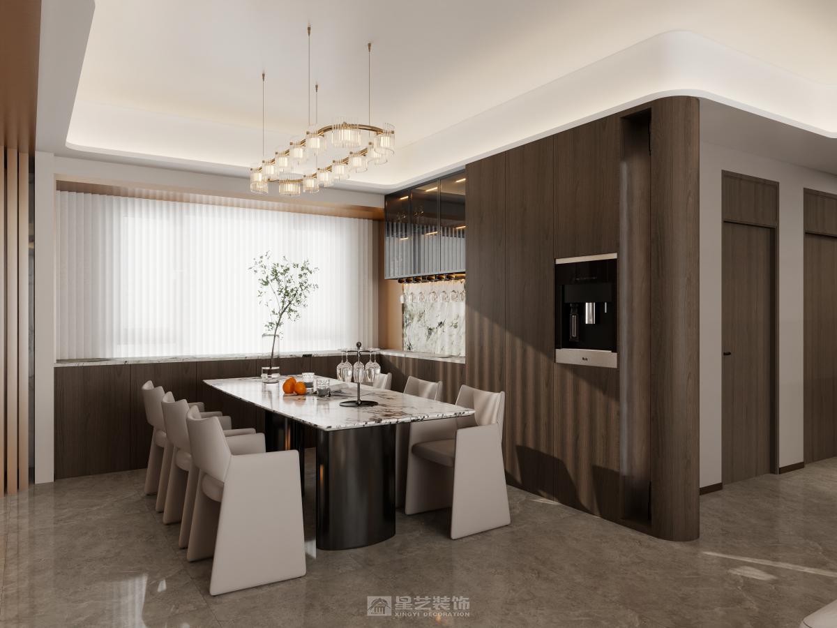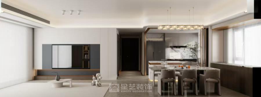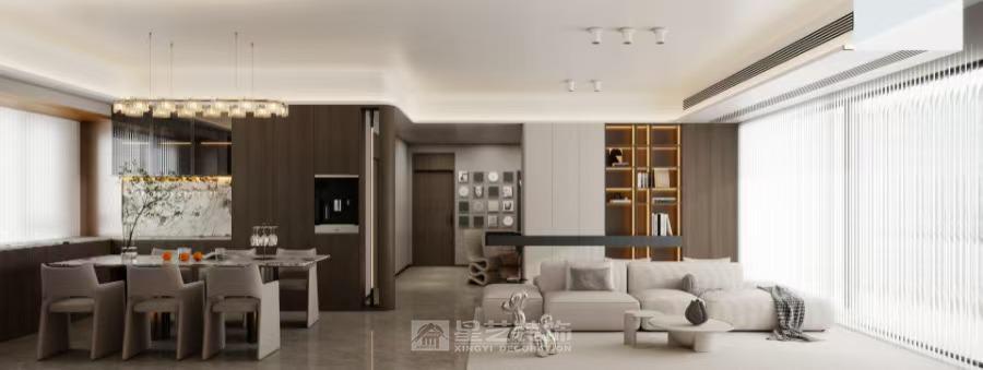 整体设计风格为现代轻奢,用了灰色胡桃木深色护墙板搭配高级灰色调搭配,以及意式风格家具融合