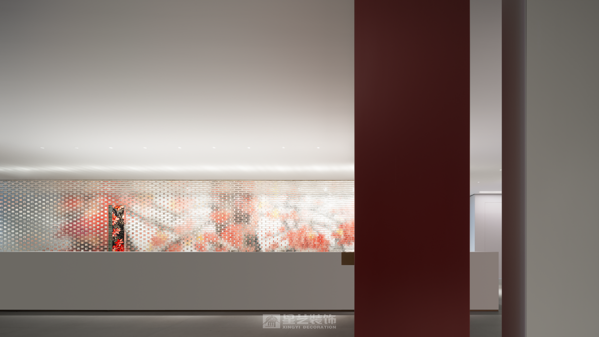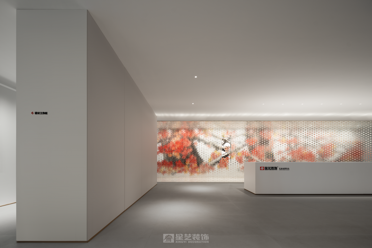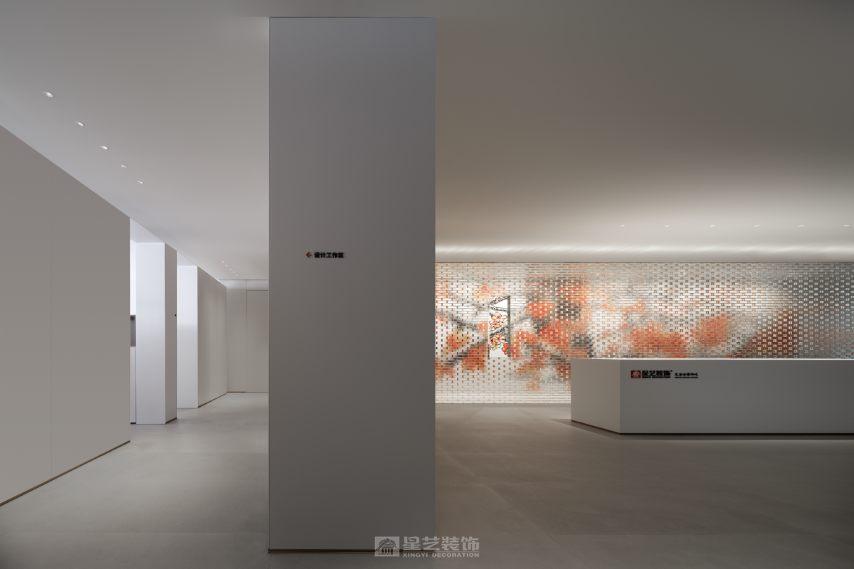 ·新翼· 这是一个企业历经32周年的再启动,历史和记忆的沉淀融入骨髓,它记录了一个地方的变迁和人们的经历。在消逝的时间里寻找永恒, 从千丝万缕到抽丝剥茧,某种程度上,都会生活与山水的哲学如出一辙,成为衔接文化与记忆的通道。,经由提纯、解构、打磨、压褶、留白、重铸的艺术工序,开启一场流连山水间、栖隐繁华里的当代隐逸实验。 星艺装饰全案中心是一个新的启航 我们需要从历史和记忆中挖掘那些具有普遍意义和价值的东西,传承下去并影响未来。前区的玻璃砖墙的每一块砖都记录了和企业息息相关的重要人物,工人、监理、设计师、客户、管理者……,前区的流水隐喻着时间的流逝, 消失的时间里面有很多有价值的东西可以挖掘和传承。我们在寻找那些能够跨越时空的永恒,把它们传承下去 流动 内外通常因墙体而界定,适当的开口或必要的材质替换,使视觉、空气、光、声音自由流动,内和外产生紧密地联系。我们在设计中一直希望能够寻找基于32的元素,在尺度和形体寻求契合,借助虚实的关系彼此串联。 原建筑落地门窗的优势为公区提供充足的光照,同时二者的互动,为空间的内外活动创造了更多的可能。木作以平面勾缝的体块形式渲染,从而建立有机的整体。 功能的合理布局,是平面构成的基础。进入空间的行为流程形成了这个空间布局基础,体块切割分别承担着不同的功能角色,有着明显区分,但又互为补充,开放的形式有利于促进人与人之间的交流。相对于木作的局部点缀,白色的基调铺陈开来,现代的审美趣味与当下的生活交并,呈现新的融合状态。 基于原始柱体的落位,尺度是空间舒适性的另一种衡量准则,办公,交互,展示、以及和人员的互动,于纵横之间,交错着路径的叠加、整合,共同构筑空间的凝聚力。 无限延续与隐喻 随机、非对称的逻辑有利于应对不规则的自由的平面布局,也可让构成的方式更具动态美感。依据一定比例,立面柜体或开放或者封闭,体块的变化与独立沙发形成前后的平衡关系一同构建了空间的活泼感和趣味性。 轴线是仪式的象征。通过中心布局的方式,与体块构成联系,空间分割不到顶的木作和天花局部木作延续了空间元素,又很好的塑造出无限的深邃意境。 生机自由之光 建筑是有机的实体,内部空隙的部分除了填充满足功能需要的实际功能,更诗意的构思便是为光提供生长的机会。 在光影的作用下,有致的窗格展现了生机的自然野趣。立面材料以体块的形式延续、伸展,平衡之中又具有方向性,简练的、有着细节的表达设计语言构成统一的整体。