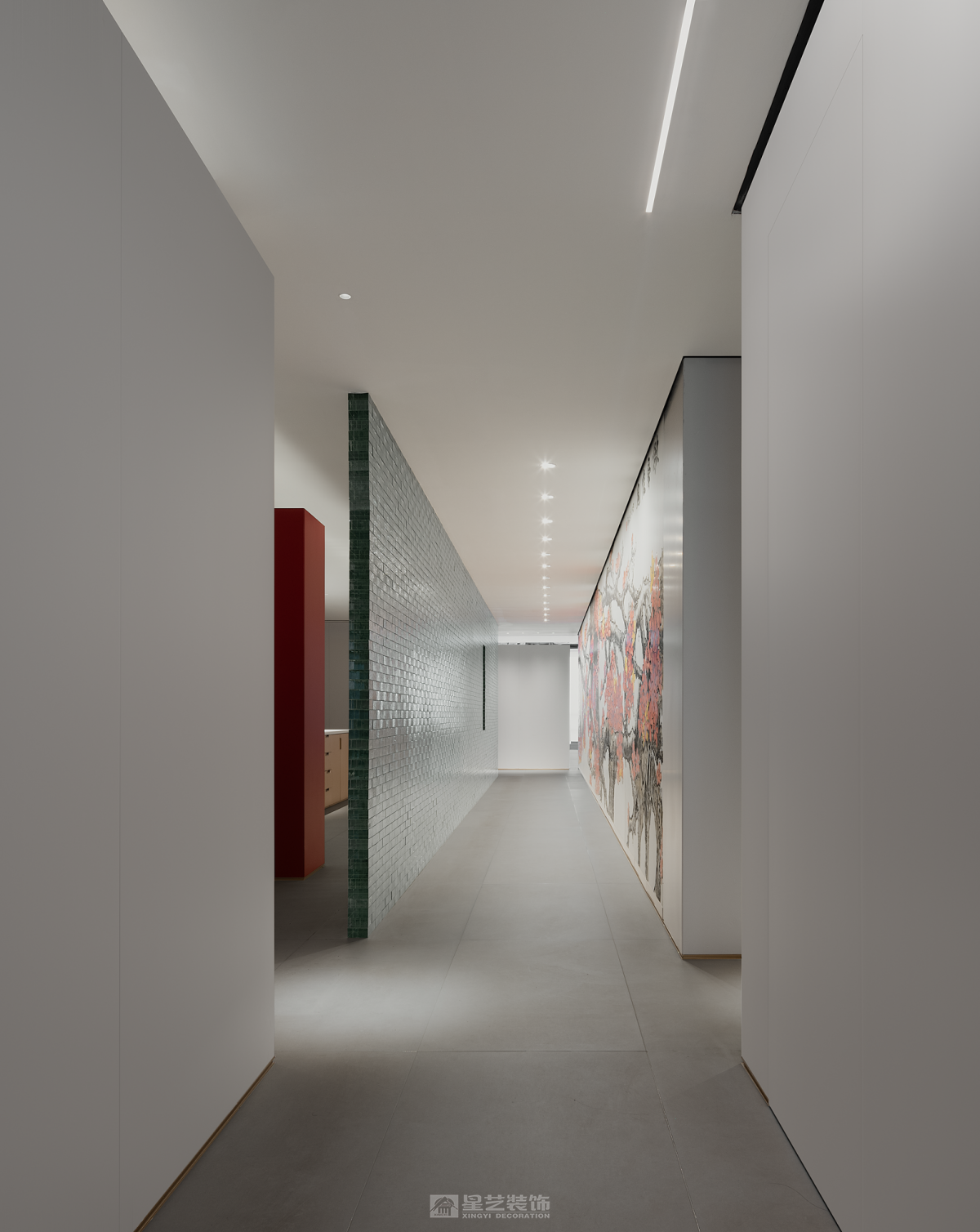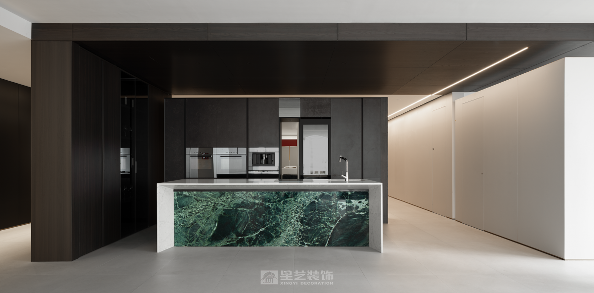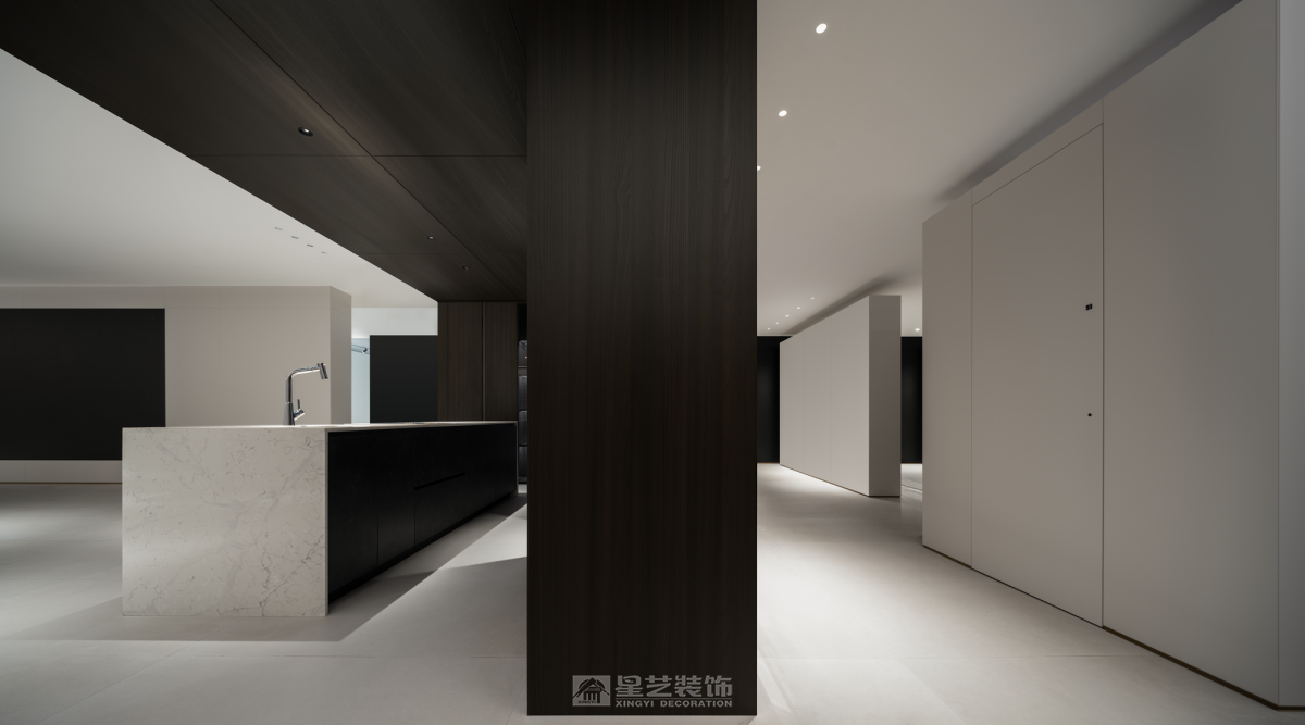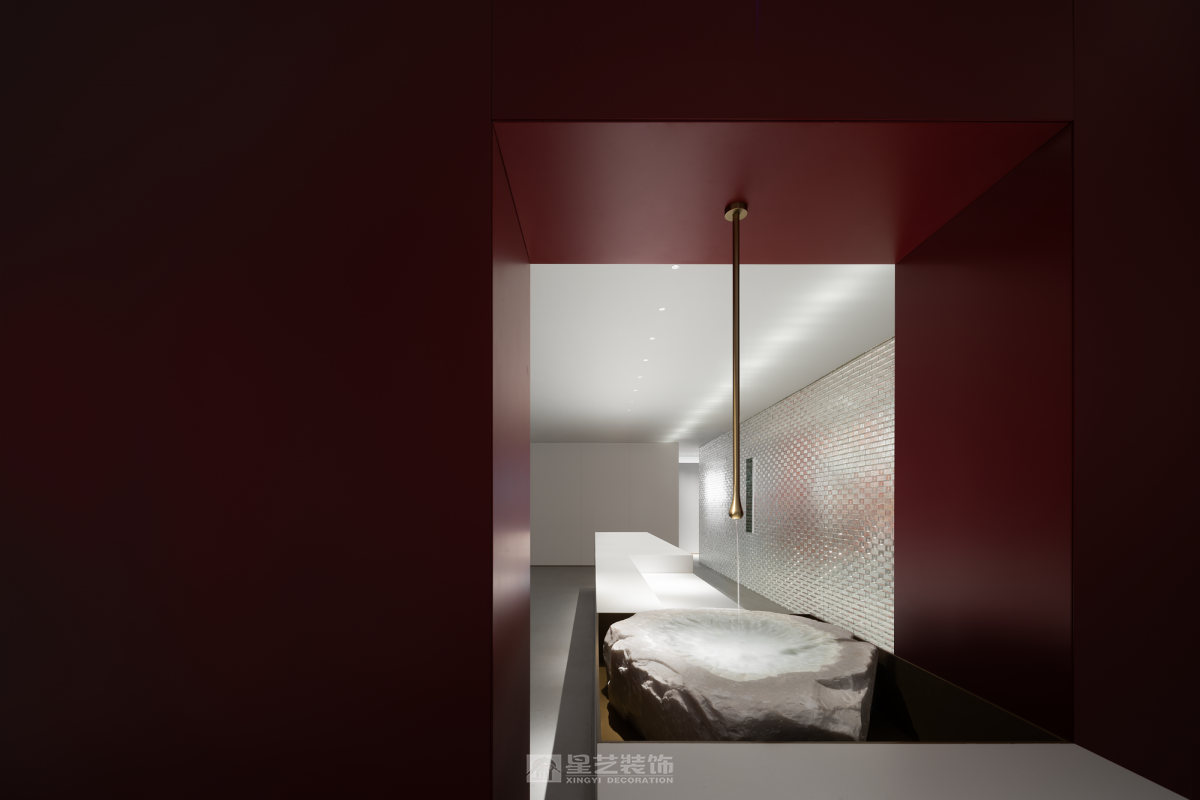 ·新翼· 这是一个企业历经32周年的再启动,历史和记忆的沉淀融入骨髓,它记录了一个地方的变迁和人们的经历。在消逝的时间里寻找永恒, 从千丝万缕到抽丝剥茧,某种程度上,都会生活与山水的哲学如出一辙,成为衔接文化与记忆的通道。,经由提纯、解构、打磨、压褶、留白、重铸的艺术工序,开启一场流连山水间、栖隐繁华里的当代隐逸实验。 星艺装饰全案中心是一个新的启航 我们需要从历史和记忆中挖掘那些具有普遍意义和价值的东西,传承下去并影响未来。前区的玻璃砖墙的每一块砖都记录了和企业息息相关的重要人物,工人、监理、设计师、客户、管理者……,前区的流水隐喻着时间的流逝, 消失的时间里面有很多有价值的东西可以挖掘和传承。我们在寻找那些能够跨越时空的永恒,把它们传承下去 流动 内外通常因墙体而界定,适当的开口或必要的材质替换,使视觉、空气、光、声音自由流动,内和外产生紧密地联系。我们在设计中一直希望能够寻找基于32的元素,在尺度和形体寻求契合,借助虚实的关系彼此串联。 原建筑落地门窗的优势为公区提供充足的光照,同时二者的互动,为空间的内外活动创造了更多的可能。木作以平面勾缝的体块形式渲染,从而建立有机的整体。 功能的合理布局,是平面构成的基础。进入空间的行为流程形成了这个空间布局基础,体块切割分别承担着不同的功能角色,有着明显区分,但又互为补充,开放的形式有利于促进人与人之间的交流。相对于木作的局部点缀,白色的基调铺陈开来,现代的审美趣味与当下的生活交并,呈现新的融合状态。 基于原始柱体的落位,尺度是空间舒适性的另一种衡量准则,办公,交互,展示、以及和人员的互动,于纵横之间,交错着路径的叠加、整合,共同构筑空间的凝聚力。 无限延续与隐喻 随机、非对称的逻辑有利于应对不规则的自由的平面布局,也可让构成的方式更具动态美感。依据一定比例,立面柜体或开放或者封闭,体块的变化与独立沙发形成前后的平衡关系一同构建了空间的活泼感和趣味性。 轴线是仪式的象征。通过中心布局的方式,与体块构成联系,空间分割不到顶的木作和天花局部木作延续了空间元素,又很好的塑造出无限的深邃意境。 生机自由之光 建筑是有机的实体,内部空隙的部分除了填充满足功能需要的实际功能,更诗意的构思便是为光提供生长的机会。 在光影的作用下,有致的窗格展现了生机的自然野趣。立面材料以体块的形式延续、伸展,平衡之中又具有方向性,简练的、有着细节的表达设计语言构成统一的整体。