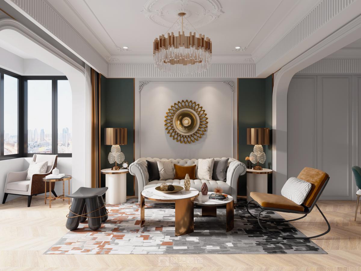 本设计采用现代法式设计风格,旨在为居住者打造一个法式风格设计理念蕴含着优雅与浪漫气息的空间。 在空间布局上,讲究对称,营造出规整、大气又平衡的视觉感受。 装饰细节方面,大量运用雕花、线条等元素,像雕花的顶角线、精致的门套线等,尽显精致细腻。