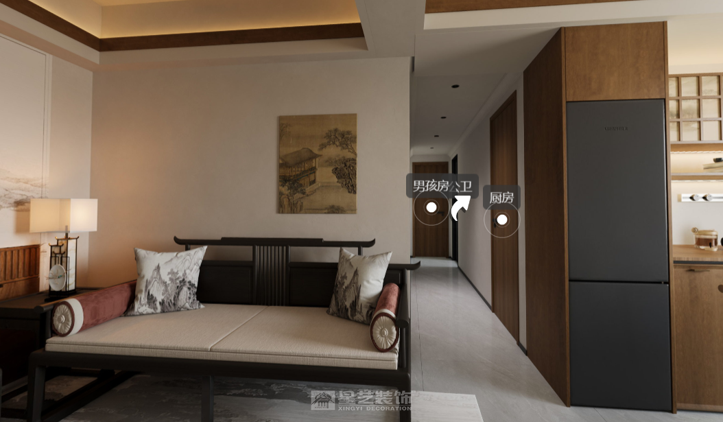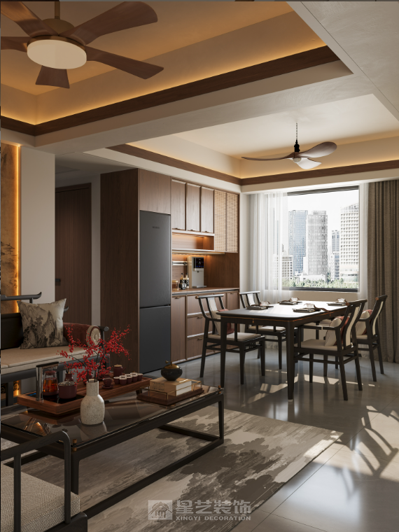 本客餐区空间以新中式为核心设计风格,融合传统中式的东方意境与现代家居的实用功能,围绕“雅韵东方、简而有致”的设计理念,打造出兼具文化底蕴与生活便捷性的居住空间。主色调选用温润的木色为基底,搭配米白色墙面、浅灰色地面,以深黑色的家具框架与软装细节作为点缀,整体色彩沉稳内敛,契合新中式风格的雅致调性;墙面的传统山水画则以浅棕、墨色为核心,与空间主色调形成呼应,强化东方美学氛围。