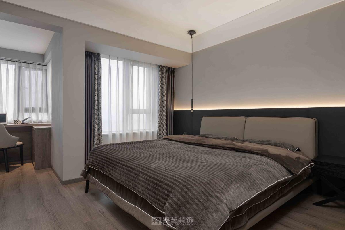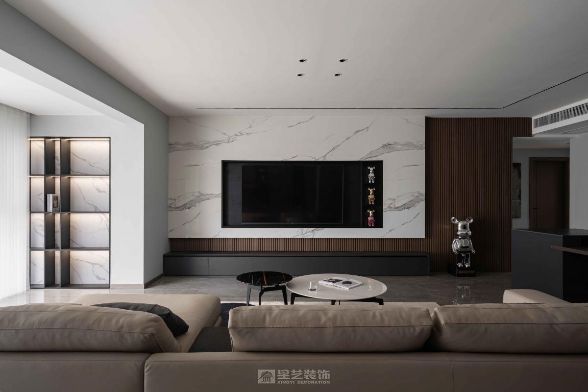 本案设计深度融合黑色元素、天然石材、意大利进口木皮及超白玻璃材质,为空间赋予了独特的现代美学与功能性。
