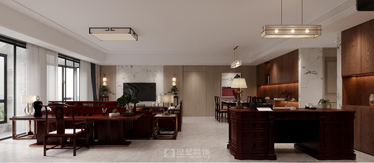 本客厅空间以新中式为核心设计风格,融合传统中式的东方意蕴与现代家居的功能逻辑,围绕“古韵新生、空间礼序”的设计理念,结合户型动线与景观优势,打造出兼具文化底蕴与居住舒适度的大宅客厅空间。