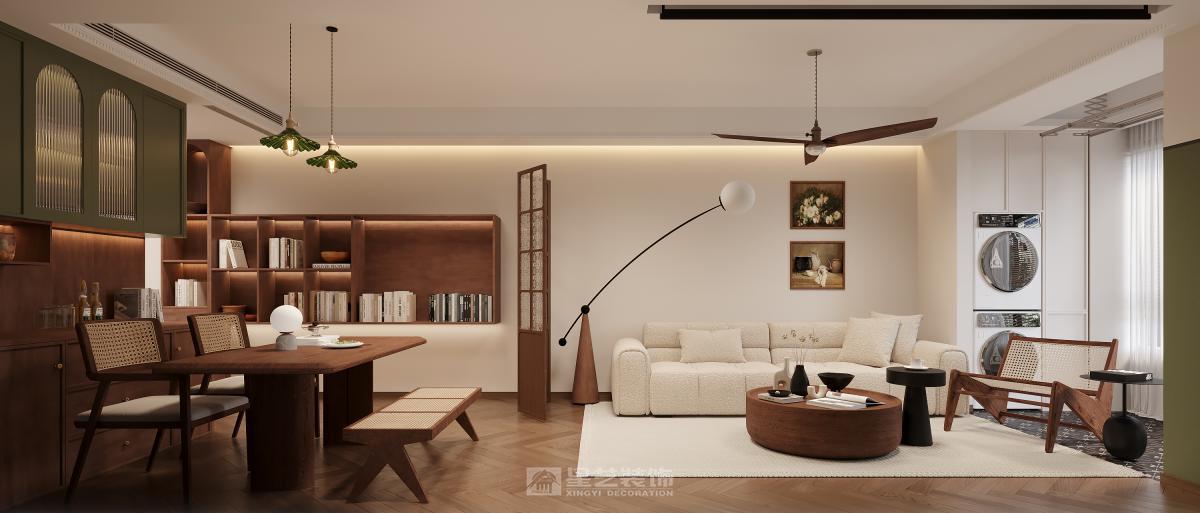 设计核心为「简形承古韵,雅境归本心」,以温润的实木肌理为基底,搭配墨绿色、茶棕、米白等雅致色系,营造沉稳内敛的空间基调。材质上融合实木、亚麻、陶瓷、哑光金属等,天然质朴又不失精致,尽显东方材质的本真之美