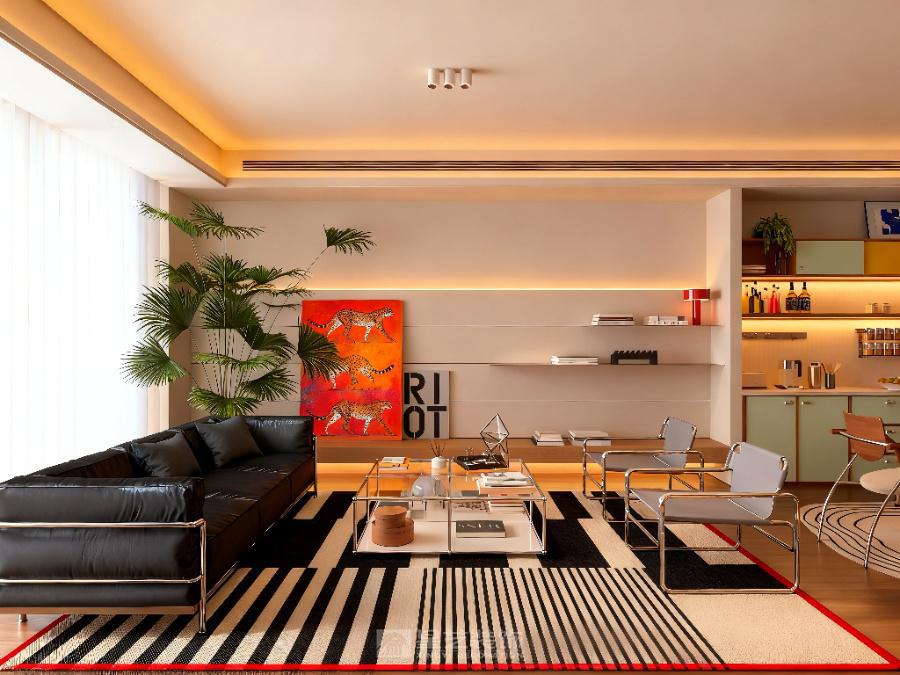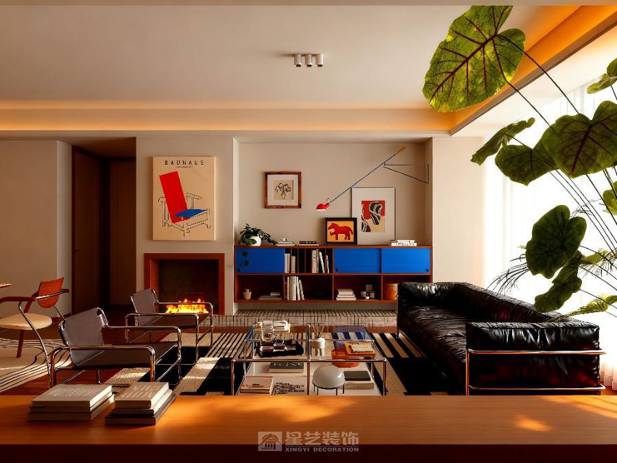 以 “复古先锋 + 艺术共生” 为核,包豪斯元素衬撞色柜体,壁炉暖光融绿植,黑白灰叠艺术画,营造复古又鲜活的个性居境
