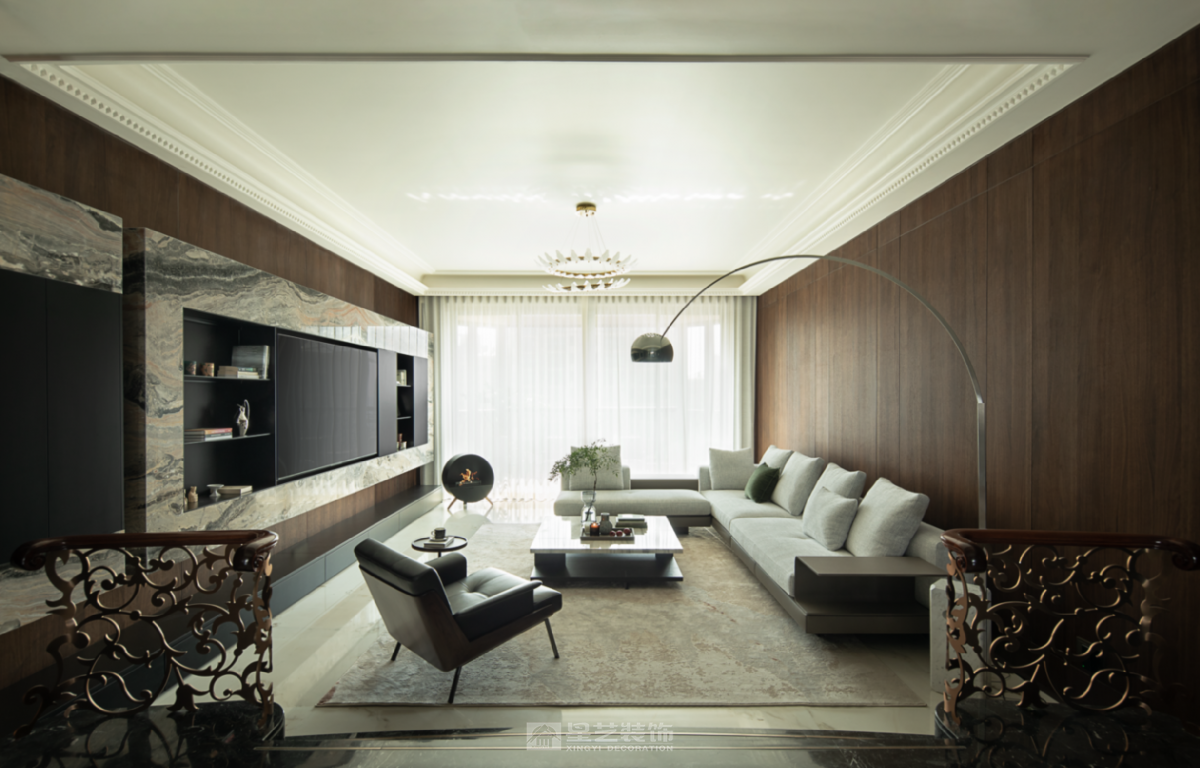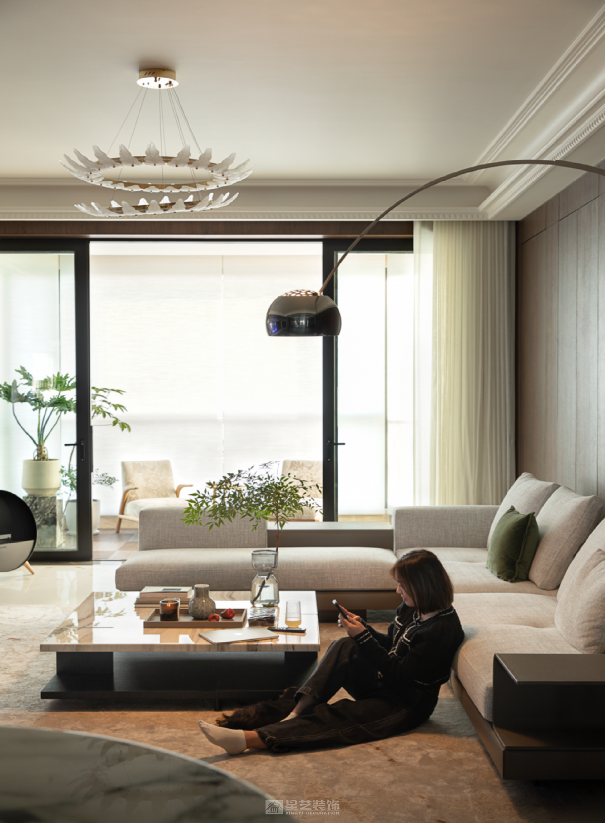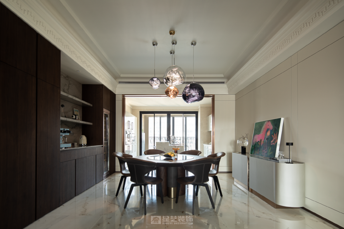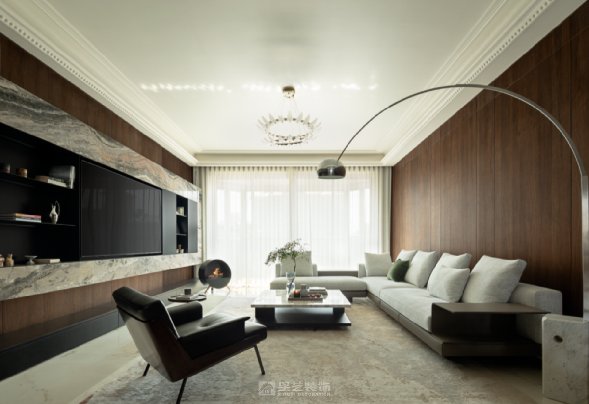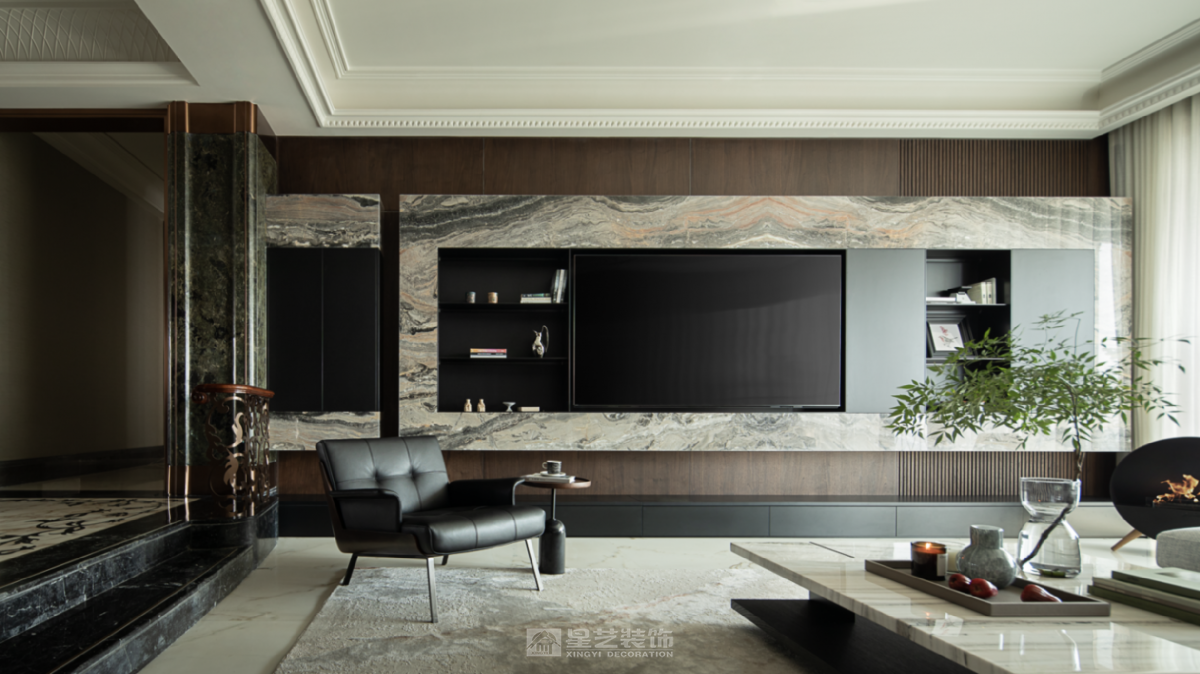 本案以奢雅为基调,融鲜活灵动艺术点缀其间,协奏出一部和谐序然的生动美学。晨光漫过亚麻纱帘的褶皱,在大理石桌面投下温柔的光斑,那些被精心调配的灰调墙面、流动的家具曲线与蓬勃生机的绿植,正以蒙德里安式的几何秩序,编织着专属于居住者的日常的诗意。