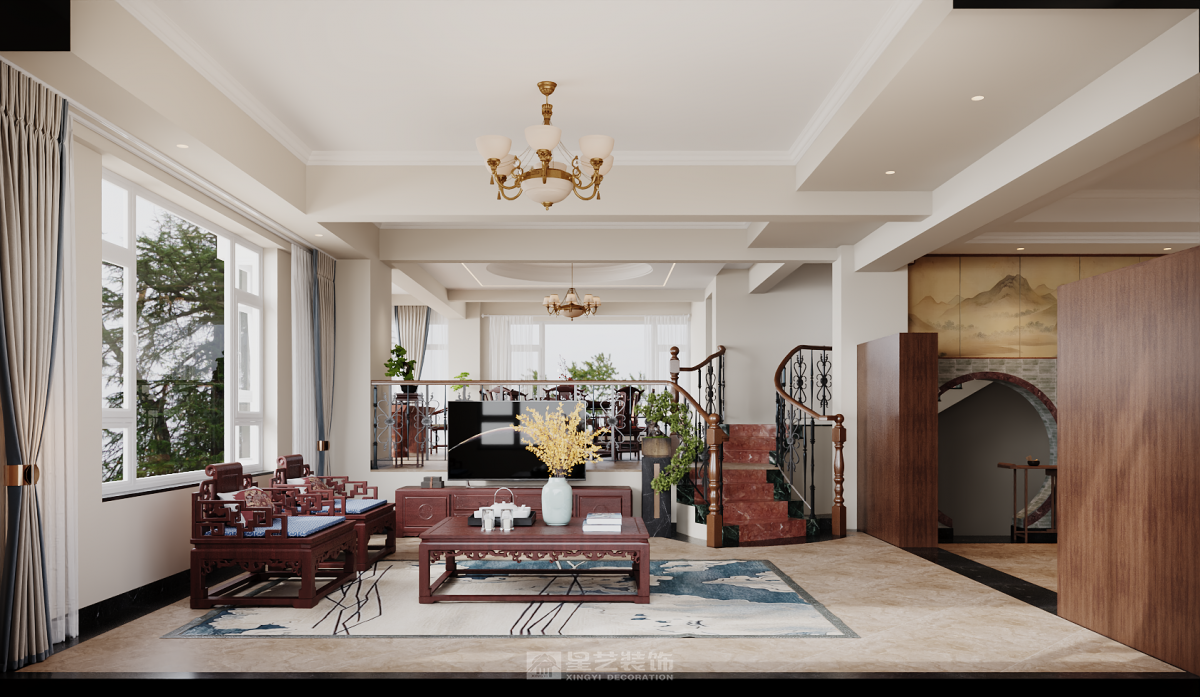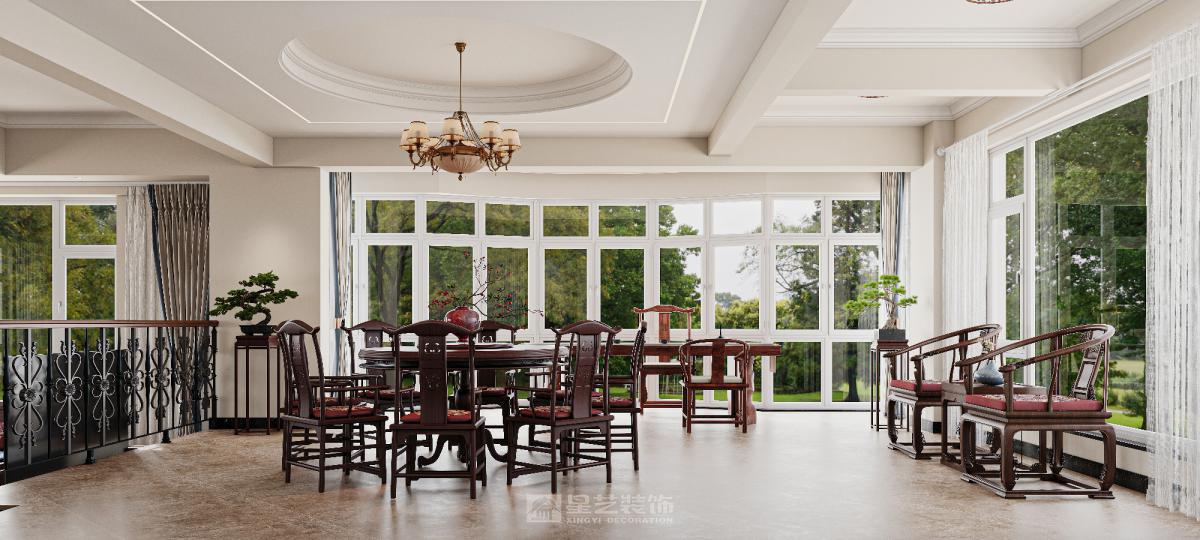 业主喜欢别墅的周边的环境,由于之前是10年前的装修,很多地方需要翻新。新中式的风格正好搭配业主的家具。新设计摈弃原来全屋吊顶的做法,保留部分小梁外露,也保证层高。
