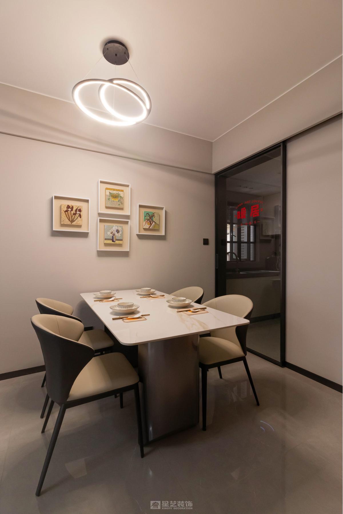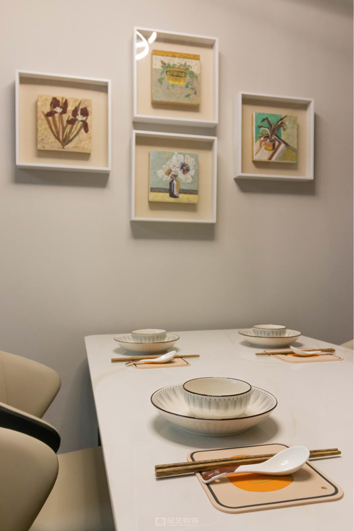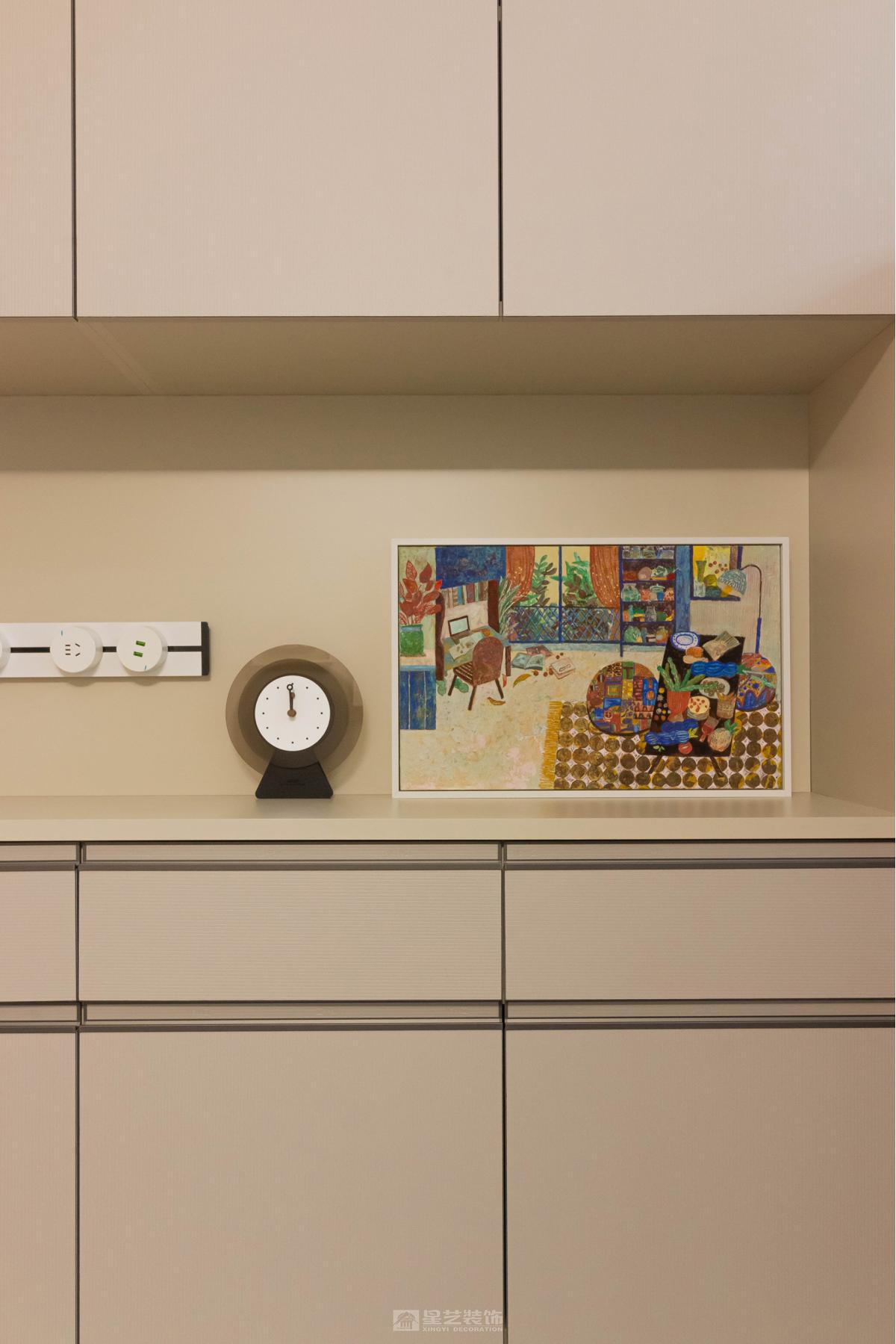 在精装房原有框架下,通过暖灰色系材质叠加丰富层次感。女主人的漆画不仅是装饰,更成为串联空间的线索,让冷静的现代风中流淌着温润的艺术气息,体现个性化居所气质。