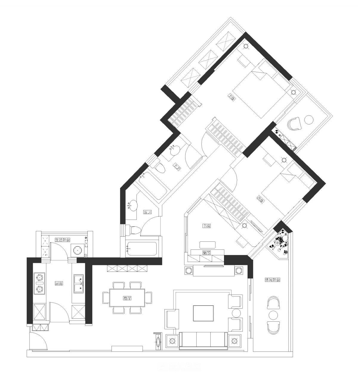 以中西合璧为设计脉络,方正客厅承东方规整气韵,倾斜过道卧室融西方灵动巧思。线条与格局的碰撞,于平衡中见新意,打造兼具秩序感与艺术感的个性家居空间。