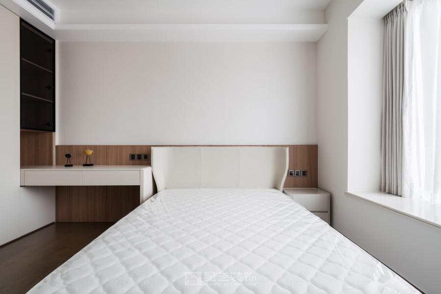 以 “极简留白的松弛起居” 为核心,用 “白 + 浅木” 的低饱和色调铺陈空间,消解小户型的局促感。一体化柜体整合床、书桌与收纳,功能隐形于简洁线条中,既满足休憩与轻办公需求,又保持视觉整洁。留白墙面与柔纱窗帘引自然光漫入,让空间更显通透;皮质床头与原木纹理的质感碰撞,在极简框架里注入温暖细节。设计以 “减法美学” 为思路,剥离冗余装饰,用功能与材质的克制平衡,让卧室成为兼具实用与静谧的舒适居所。