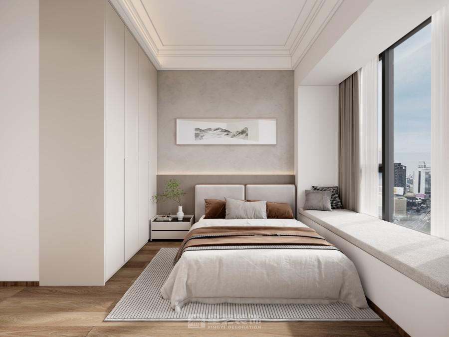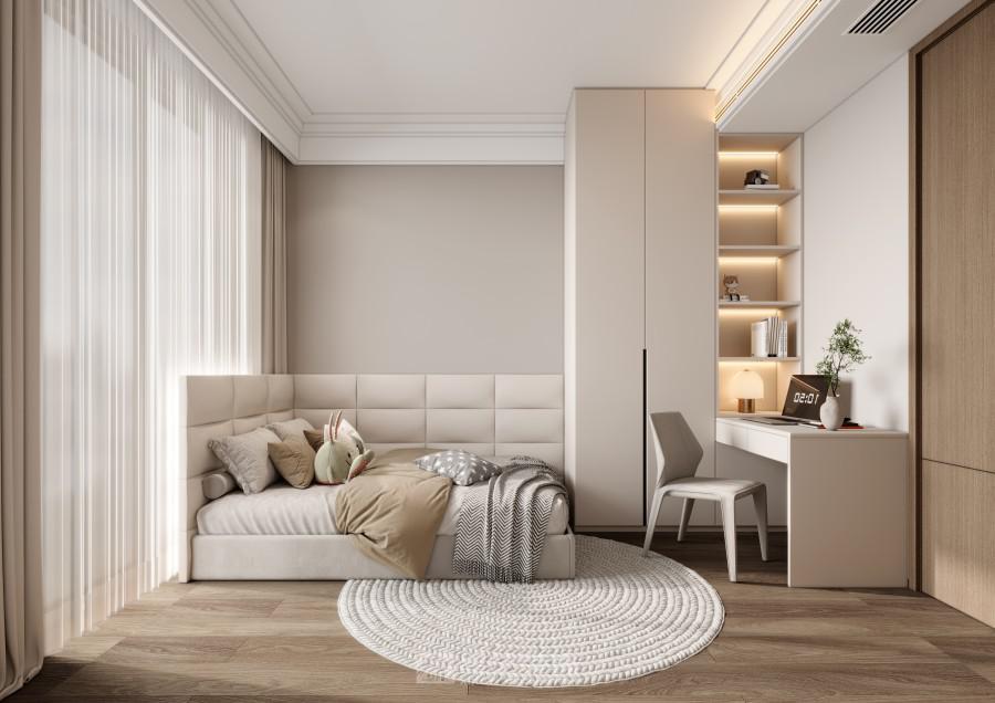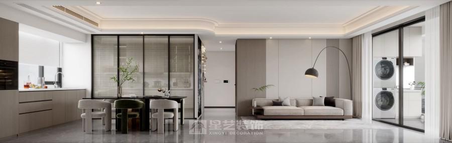 浅灰调基底 + 柔纱质感软装,营造松弛氛围;弧形吊顶与金属灯具点缀,平衡柔和与精致。布局上,餐厨区的跳色餐椅激活空间活力,洗衣区的隐形收纳消解琐碎感,巨幕窗引光入室,让都市居所兼具 “无界通透的开阔” 与 “功能整合的实用”,适配多元日常场景。