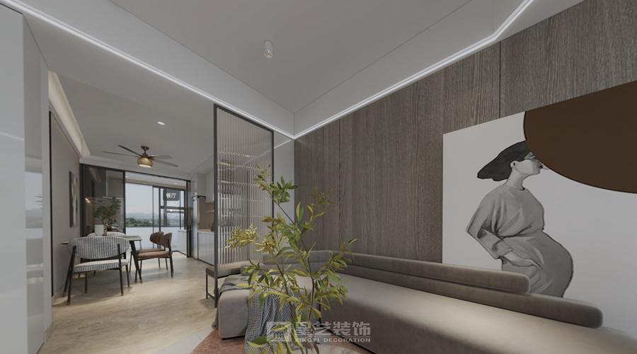 以现代侘寂风为基底,融合简约轻奢的设计巧思。深木色护墙奠定沉稳质感,浅咖布艺沙发柔化空间线条,金属格栅屏风营造层次通透感。艺术挂画与绿植相映成趣,无主灯设计的线性光带勾勒轮廓,让空间在质朴与精致的平衡中,流露慵懒又高级的生活氛围。